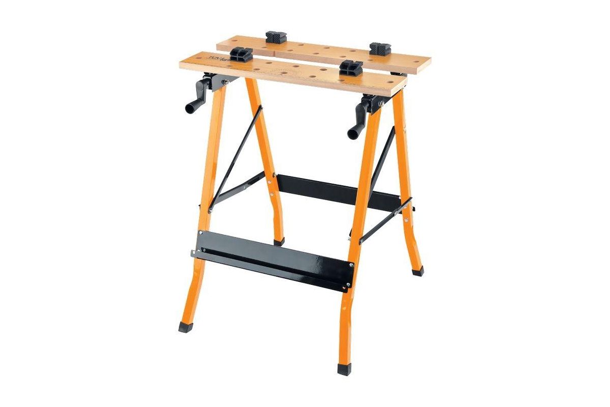 Верстак представляет собой складную металлическую конструкцию с раздвижной столешницей из МДФ, которая является одновременно и тисками. Это позволяет зажимать под разными углами заготовки обрабатывающий инструмент. Удобен в эксплуатации, имеет небольшие габаритные размеры. Специальная конструкция предусматривает хранение верстака в собранном виде, без демонтажа каких-либо элементов. Размер 880 х 135 х150 мм в собранном виде.