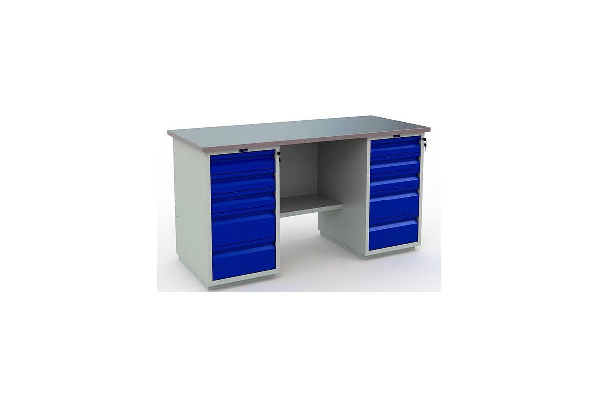 Размеры внешние, мм (ВхШхГ): 880x1600x700. Максимальная нагрузка на верстак - 1000 кг. Столешница верстака изготовлена из МДФ толщиной 24мм покрытой оцинкованным листовым металлом толщиной 1,2 мм. В комплекте 2 тумбы WD-5, которые имеют по 5 выдвижных ящиков, укомплектованных телескопическими направляющими, нагрузка на ящик 30 кг. Цвет: RAL 7038, ящики тумбы RAL 5002. Тип покрытия: порошковое. Дополнительно верстак можно укомплектовать перфорированным экраном соответствующего размера, светодиодным освещением и аксессуарами для инструментов.