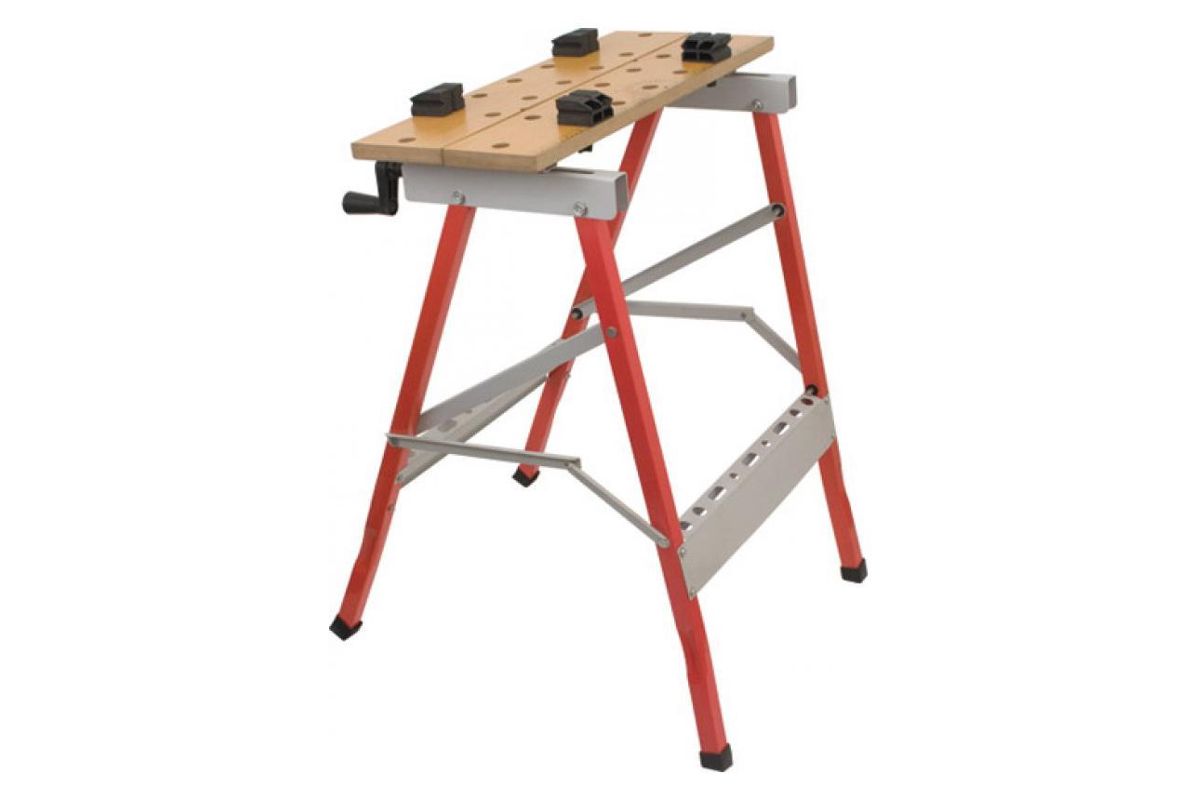 С двумя зажимными механизмами и столешницей, состоящей из 2-х половин (подвижной и неподвижной), предназначен для установки и фиксации различных изделий (весом до 100 кг и шириной до 23.5 см) с целью их обработки. Сечение ножки 25x25 мм. Материал: сталь, столешница из МДФ материала. Упаковка: картонная коробка.