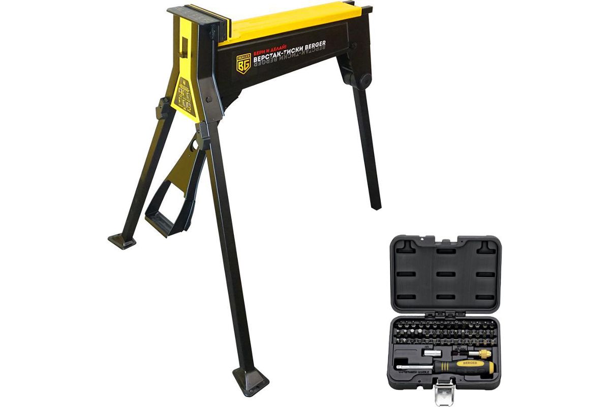 В состав набора входят: Верстак BERGER BG1298 универсальный складной с быстрозажимными тисками, Набор бит BERGER BG-45SB ручка+биты 45 предметов в кейсе