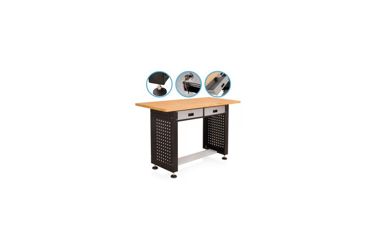 Верстак с 2 выдвижными ящиками 1475х610х900 мм WEDO WD1331 представляет собой рабочее место для проведения слесарных работ. Столешница этой модели выполнена из массива дерева толщиной 30 мм. Отличительными особенностями верстака является наличие двух ящиков, запирающихся на ключ, а также прочные ножки с регулировкой по высоте.