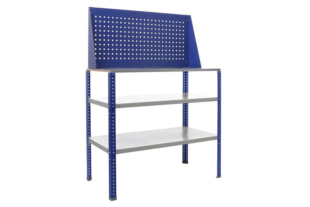 Размеры внешние, мм (ВхШхГ): 1420x1000x500. Вес, кг: 31, Количество полок: 2. Столешница выполнена из мебельного щита (сосна 18 мм), на верхней части щита установлена накладка из оцинкованного листа металла толщиной 1.2 мм, распределенная нагрузка 300 кг. Опоры изготовлены из стойки с профилем сечения 40х40 мм, толщина стали стоек 1,5 мм, шаг перфорации 50 мм. На опорах установлены пластиковые подпятники. Комлект верстака оснащен двумя полками с нагрузкой до 100 кг и экраном . Верстак возможно дополнить ящиком (нагрузка 30 кг) и комплектом освещения.
