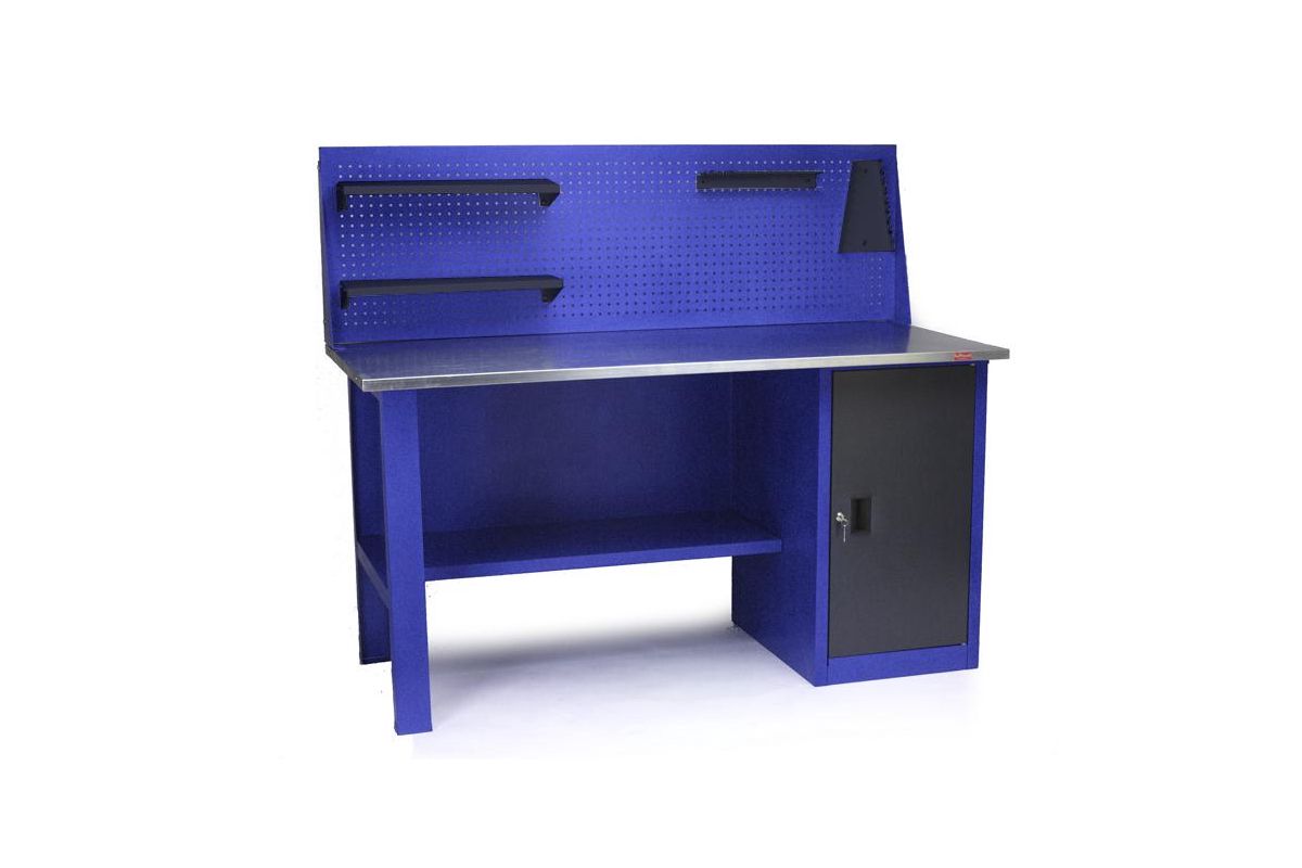 (ВхШхГ)870х1600х700. Состоит из: Столешница (фанера 24 мм. + оцинкованный металл 1мм); Тумба с дверцей; Опора; Полка-стенка; Экран с комплектом навесок.