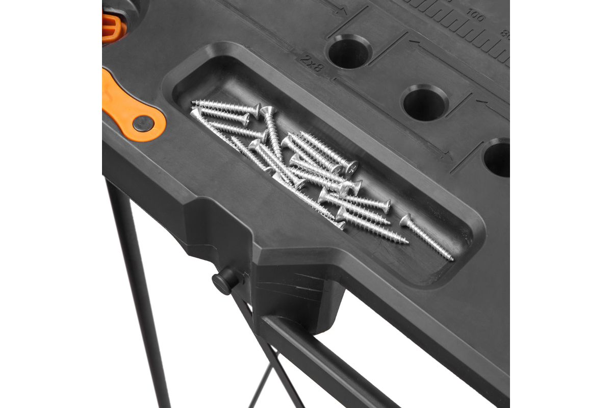 На столешнице есть углубления. Туда можно положить мелкие инструменты или крепёж – всё будет под рукой.