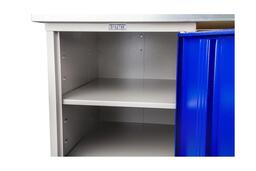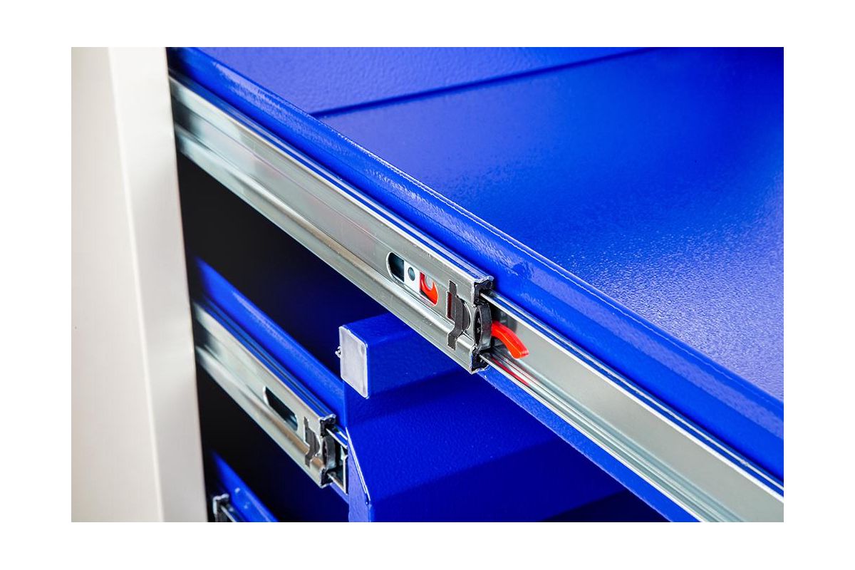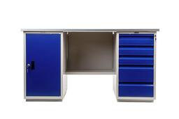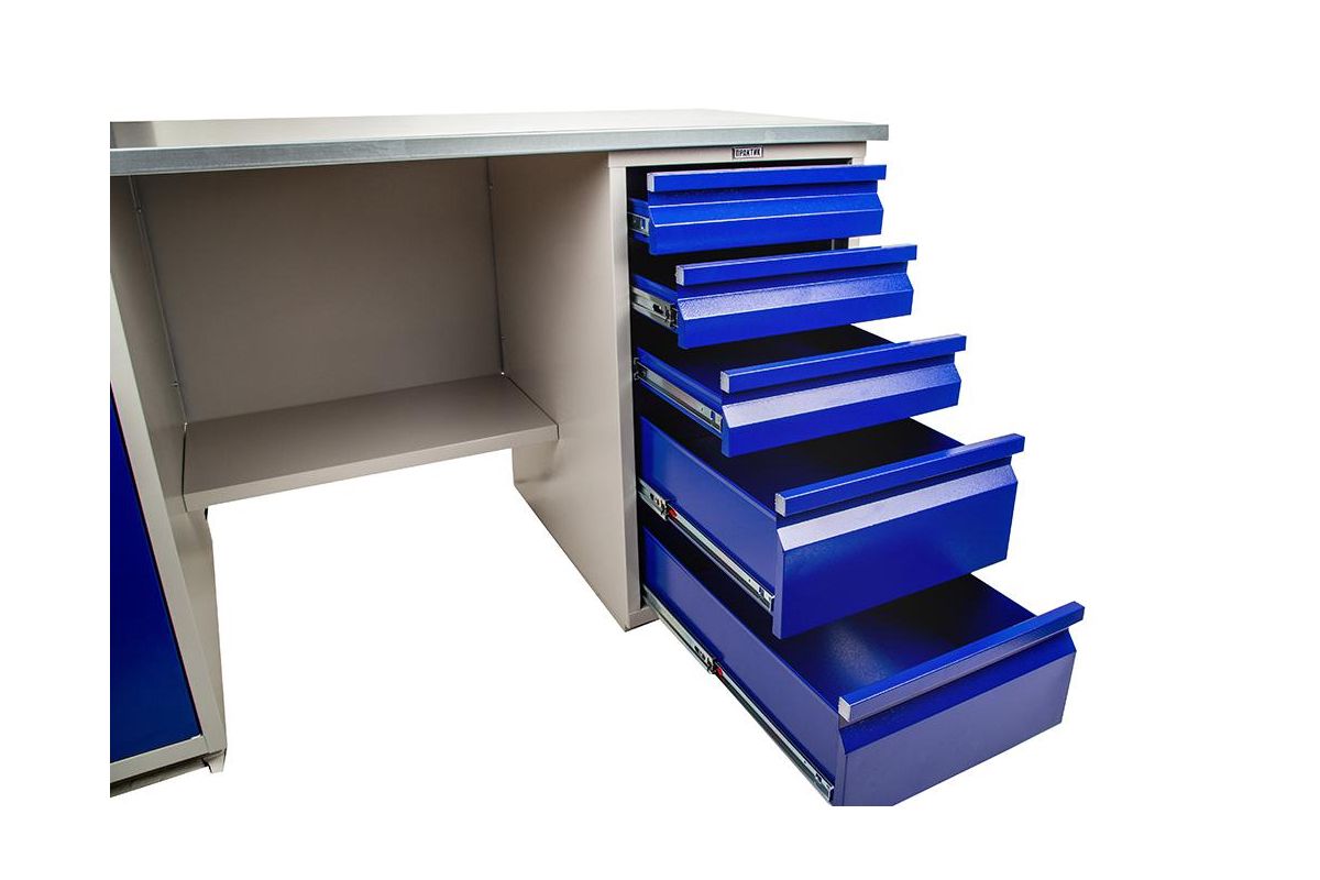 Размеры внешние, мм (ВхШхГ): 880x1600x700. Максимальная нагрузка на верстак - 1000 кг. Столешница верстака изготовлена из МДФ толщиной 24мм покрытой оцинкованным листовым металлом толщиной 1,2 мм. В комплекте 2 тумбы. Тумба WD-1 укомплектована 2-мя съемными регулируемыми полками и 1 дверцей с ключевым замком, есть возможность смены стороны открывания двери, нагрузка на полку тумбы 30 кг. Тумба WD-5 имеет 5 выдвижных ящиков, укомплектованных телескопическими направляющими, нагрузка на ящик 30 кг. Цвет: RAL 7038, дверь тумбы и ящики тумбы RAL 5002. Тип покрытия: порошковое. Дополнительно верстак можно укомплектовать перфорированным экраном соответствующего размера, светодиодным освещением и аксессуарами для инструментов.