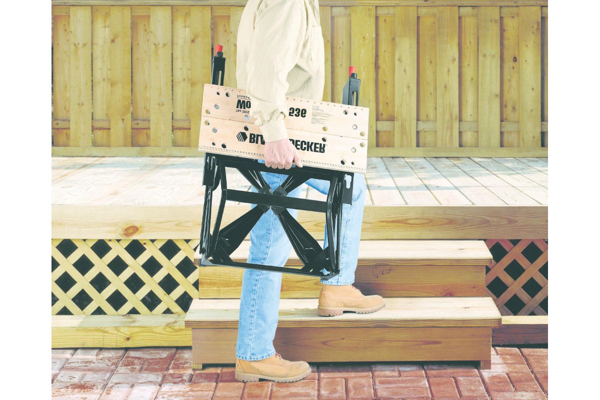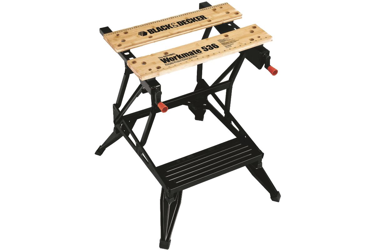 Верстак складной Workmate®. Нагрузка - 250 кг; Высота - 775/595 мм; Ширина зажима - 136 мм; Длина/ширина стола - 610/384 мм; Материал стола/каркаса - ДСП/сталь; Вес - 10,7 кг; Упаковка - коробка.