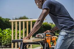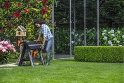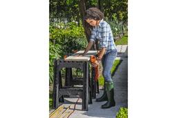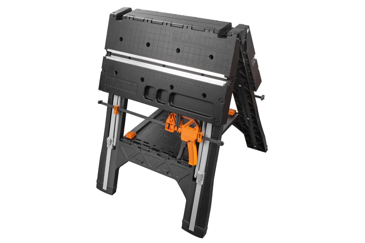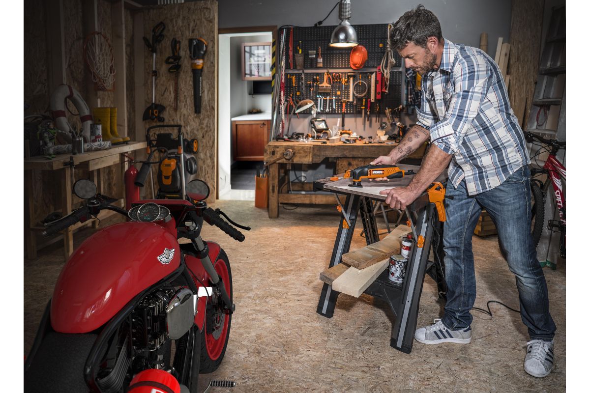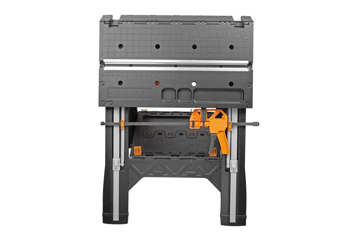 WORX WX051 универсальный рабочий стол, который может быть использован как козлы для распилки дерева. Встроенные системы зажима. Складной лоток для хранения инструментов.Универсальные быстрые зажимы совместимы с продуктами Worx. Можно регулировать размер рабочей поверхности. Данная модель поставляется в картонной коробке.
