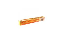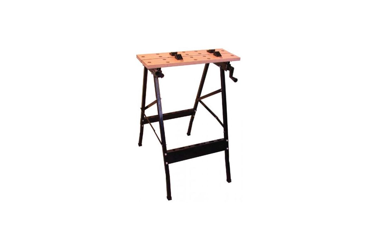 Складной верстак для удобства работы с деталями сложной формы, фиксации заготовок. Столешница изготовлена из прочной ДСП, на них имеется ряд отверстий для установки съёмных поворотных пластиковых упоров для фиксации заготовок. Металлические опоры легко складываются для хранения. Максимальная ширина зажимаемого изделия 230 мм.