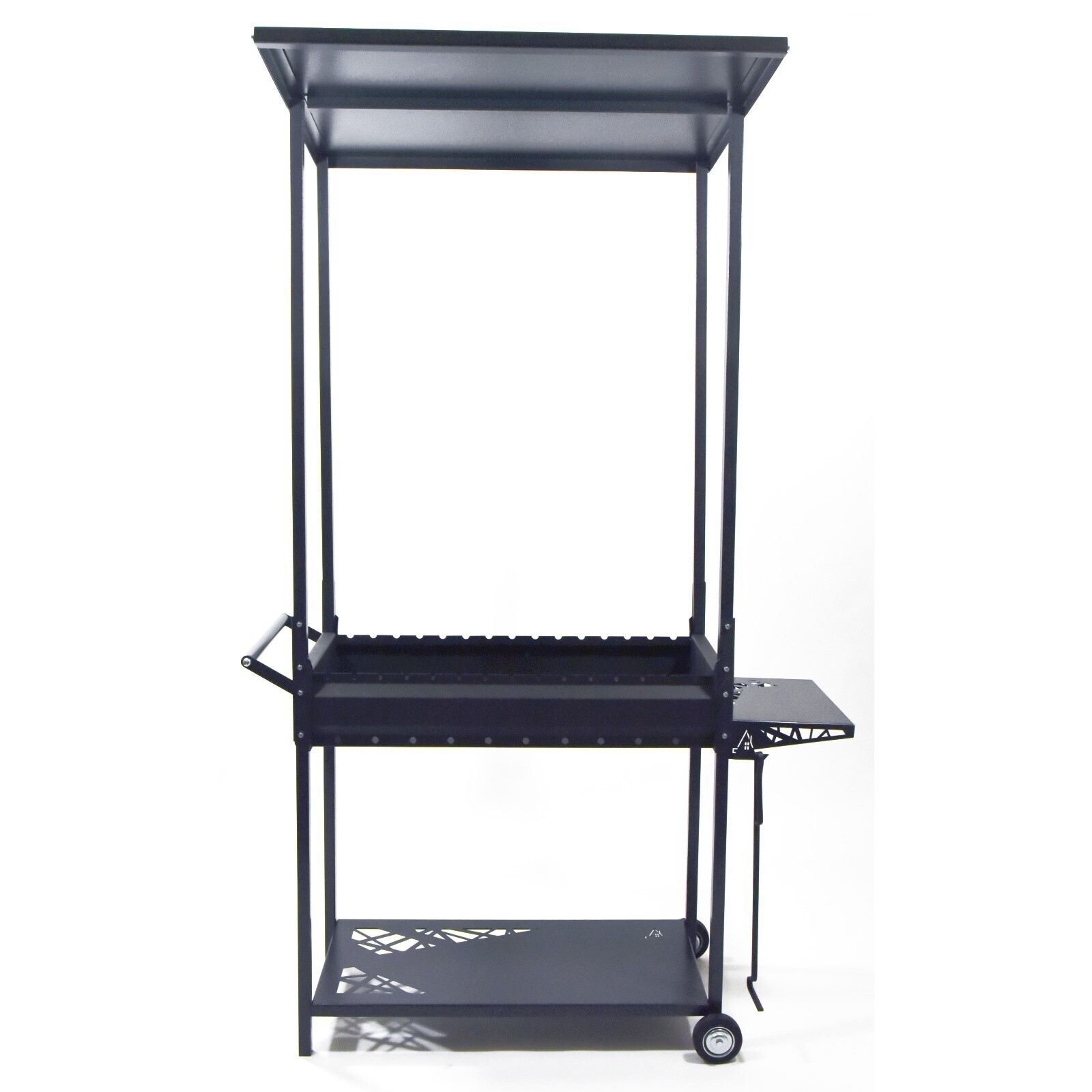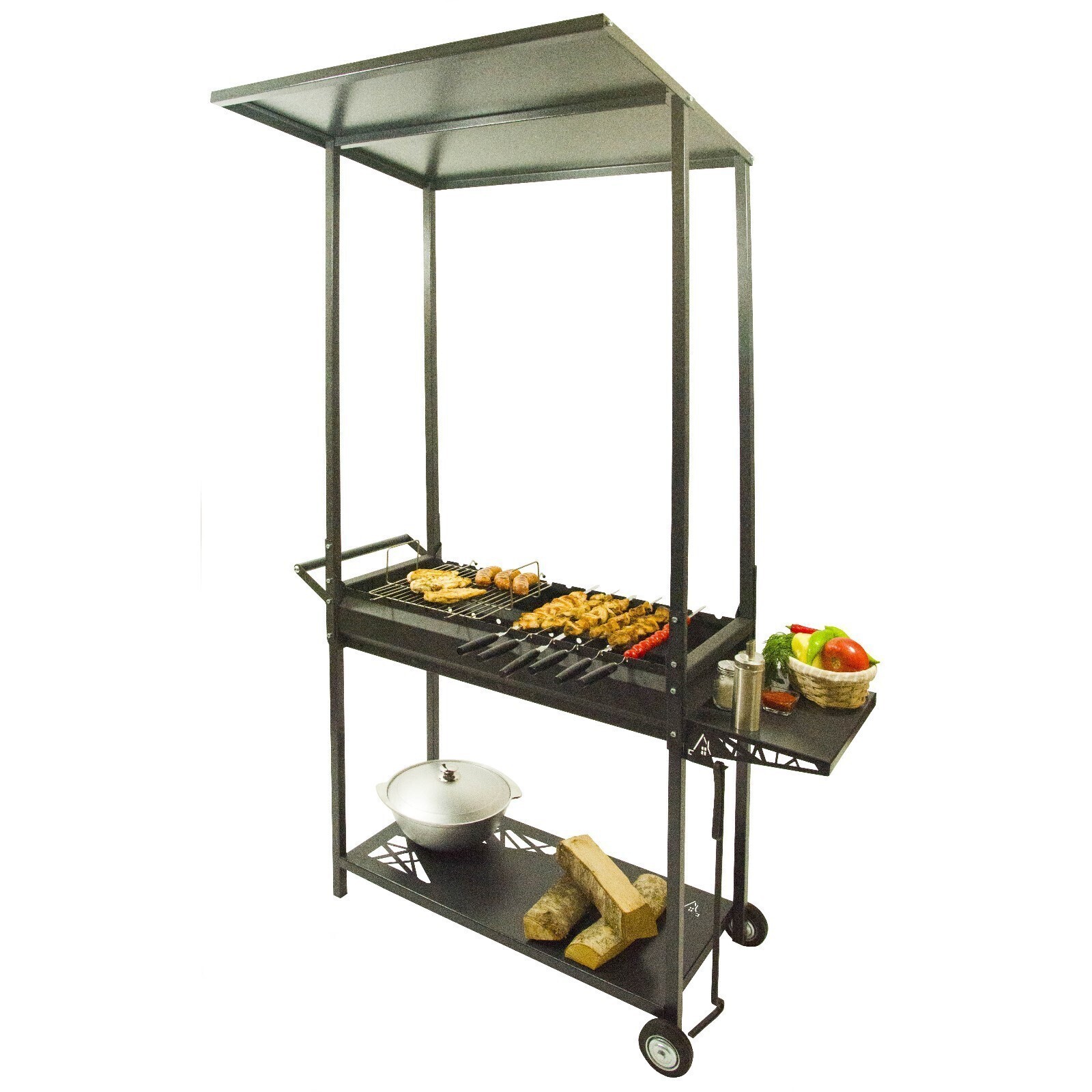 Современный, надежный, функциональный мангал с крышей. Изготовлен из толстой стали. Можно использовать как уголь, так и дрова.