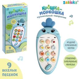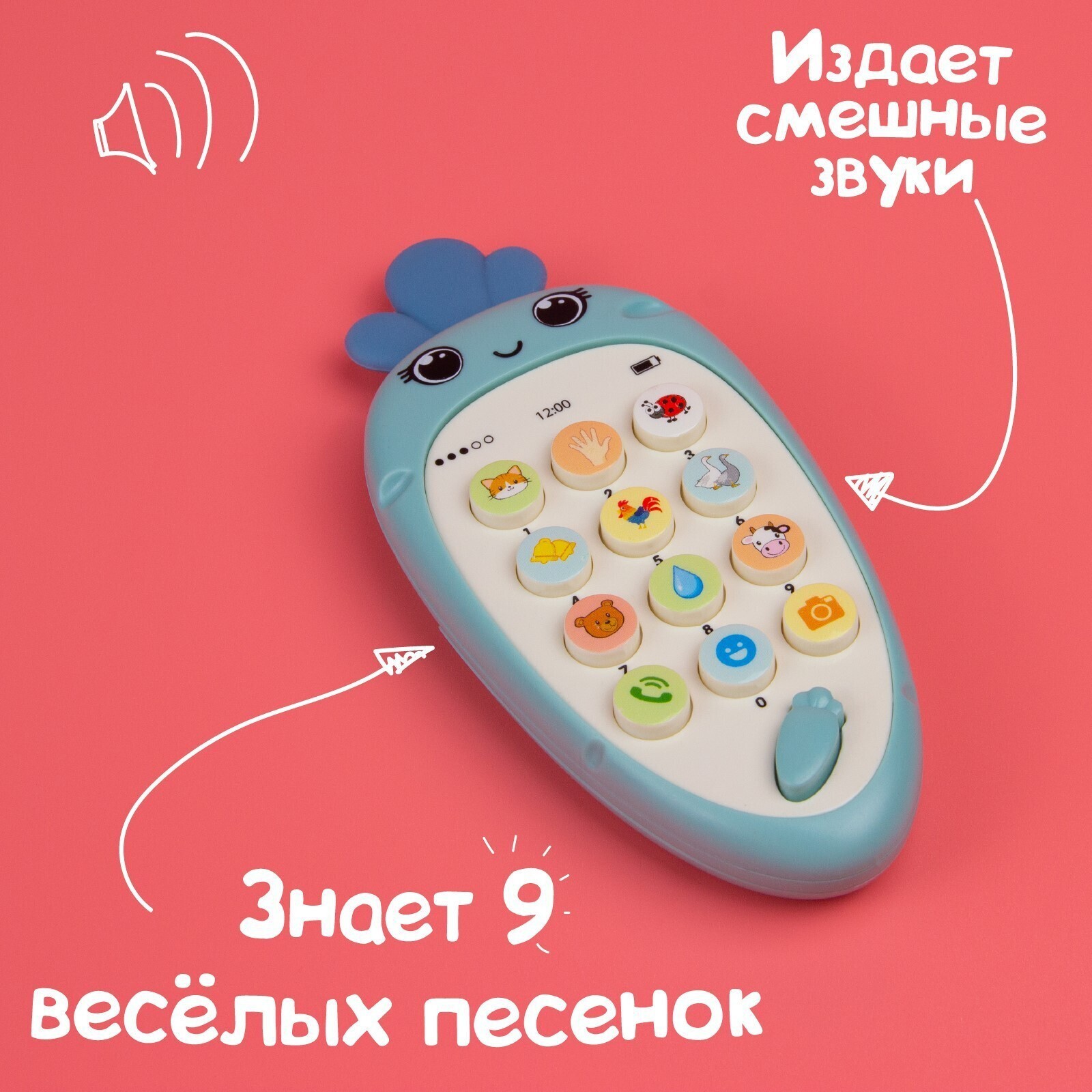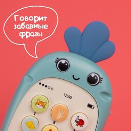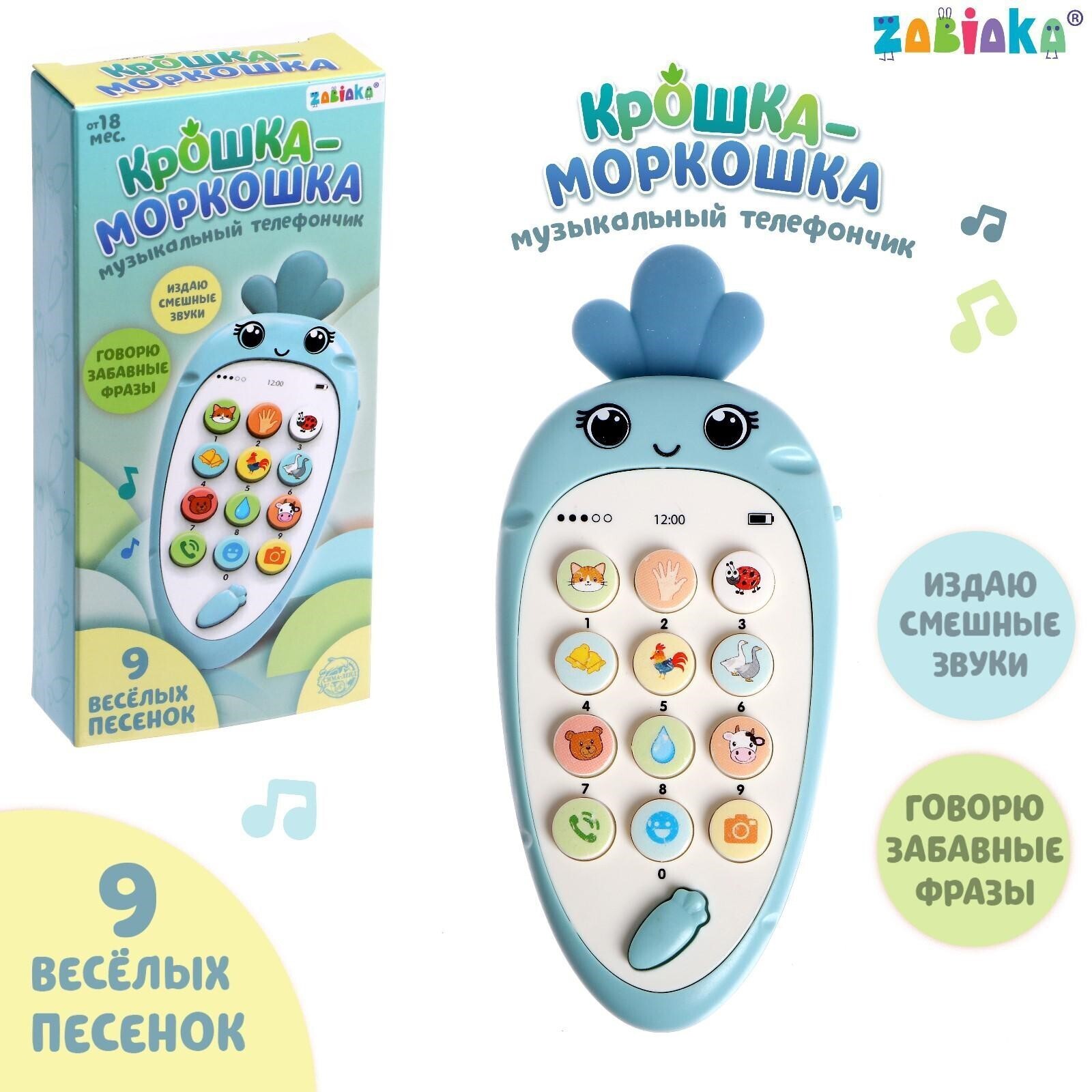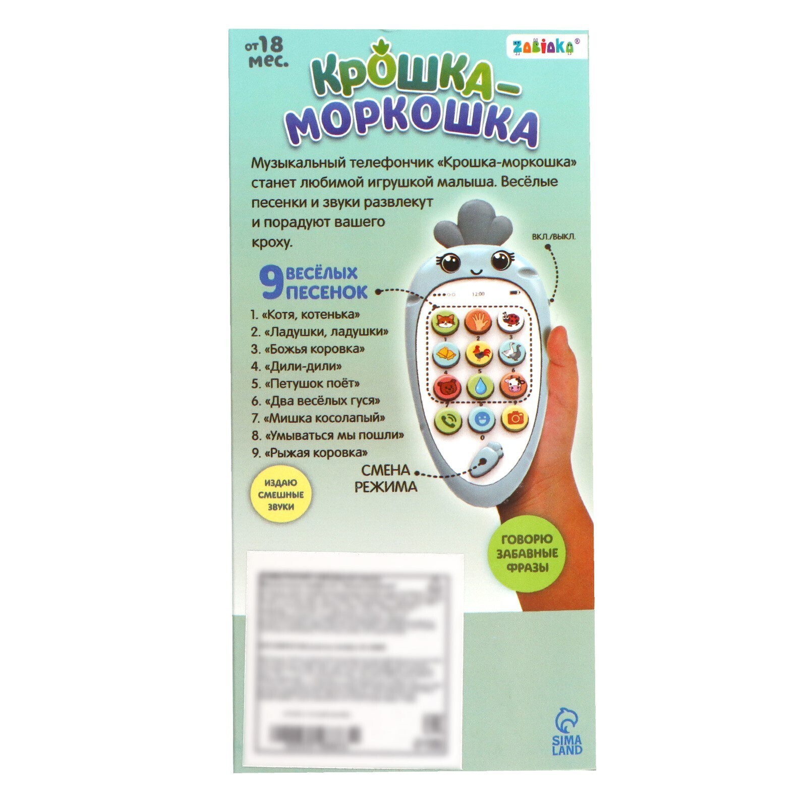 Малыш обязательно подружится с музыкальным телефончиком в виде забавной морковки. Крошка-моркошка издаёт смешные звуки, говорит забавные фразы и знает 9 весёлых песенок.