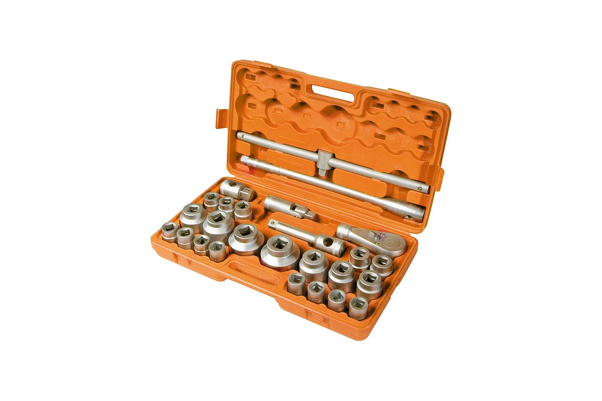 Набор головок для грузовых автомобилей и автобусов. В комплект входят: трещоточный ключ под квадрат 3 4, вороток Т-образный с присоединительным квадратом 3 4, удлинитель 100 и 200 мм, 6-гранные торцевые головки, 19, 21, 22, 23, 24, 26, 27, 30, 32, 34, 36,