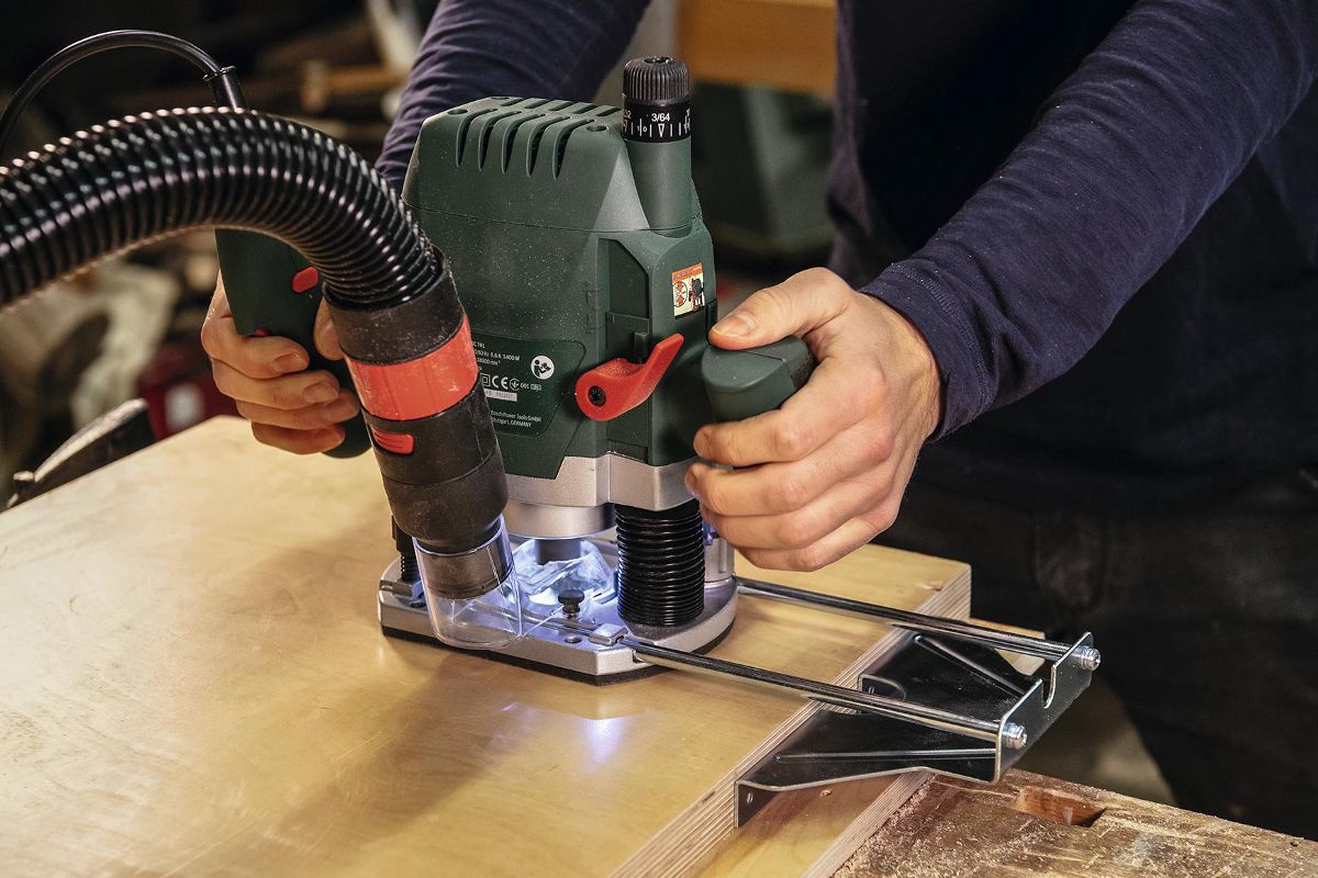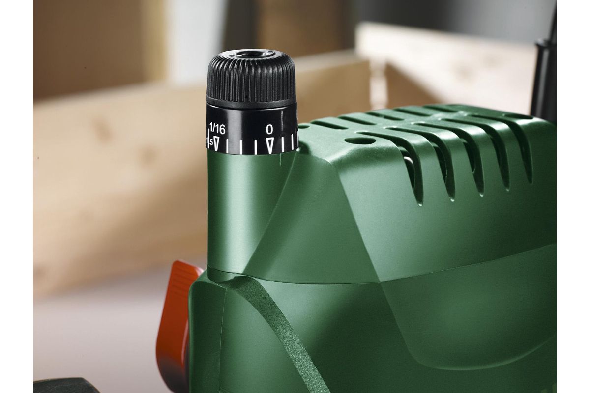 Глубина фрезерования настраивается с помощью ограничителя. Для точной настройки на корпусе есть линейка.