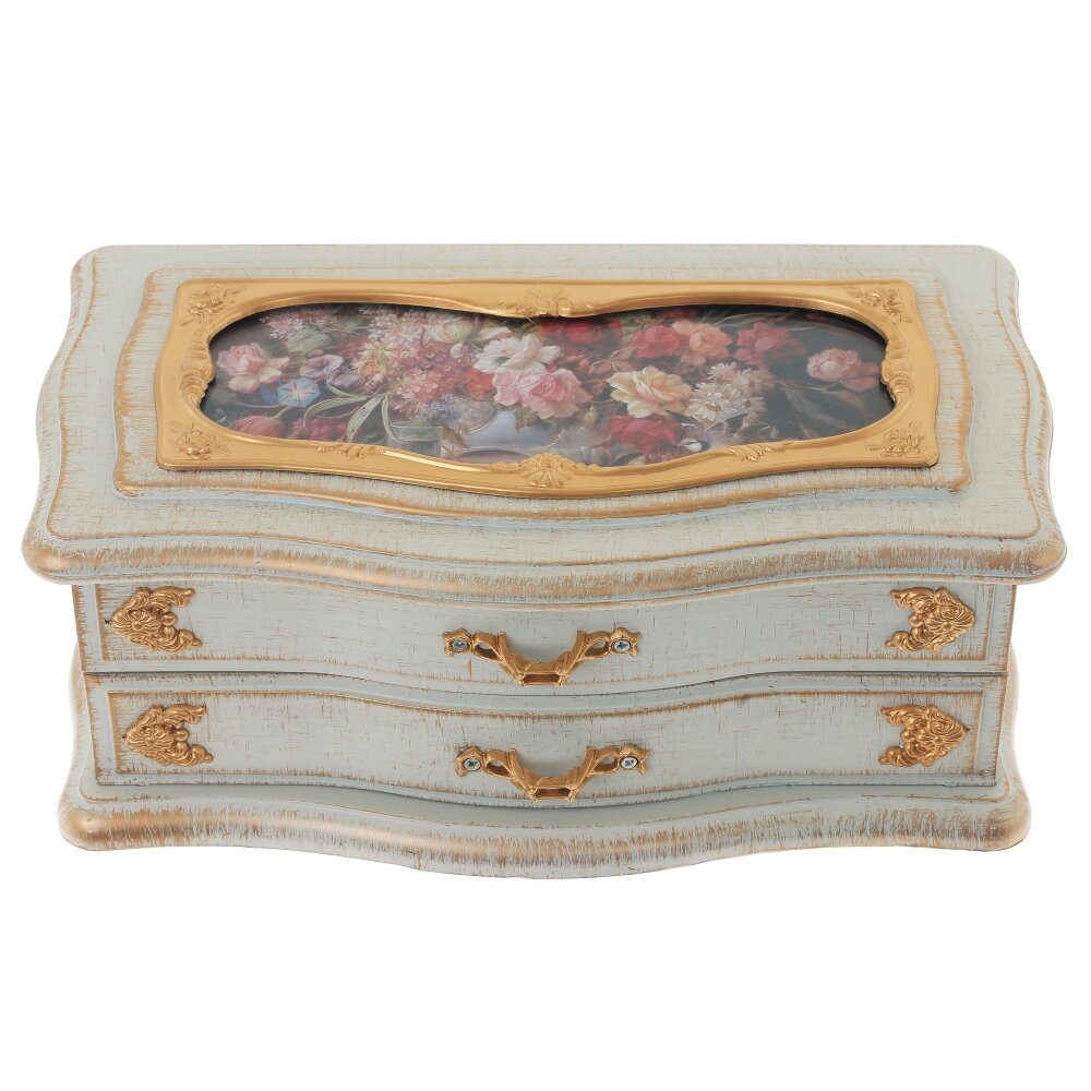 Шкатулка для украшений музыкальная, в форме "Комода" выполнена под старину. Крышка декорирована цветочным рисунком, внутри с зеркалом. Имеет выдвижной ящичек. Работает от заводного ключа.
