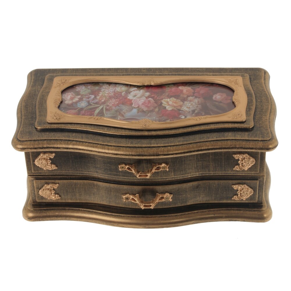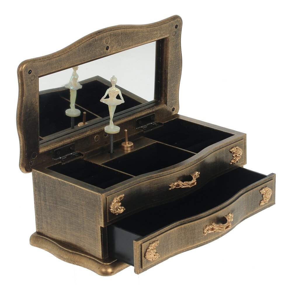 Шкатулка для украшений музыкальная с зеркалом, в форме "Комода" под старину темно-коричневого цвета с золотом, на верхней крышке вставка картины с цветами, при открывании шкатулки появляется фигурка балерины, нижний ящичек выдвигается, изготовлена из полимерных материалов. Работает от заводного ключа.
