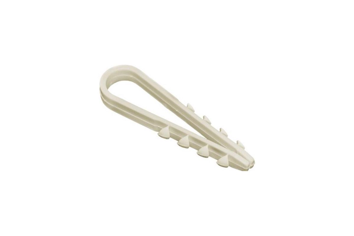 Простейший вариант дюбель-хомута представляет собой полоску пластика шириной 6–8 мм, согнутую в виде скобы. На концах ее имеются зубчики. Когда дюбель вставляют в отверстие в стене, зубчики упираются в материал и обеспечивают вполне надежное крепление.