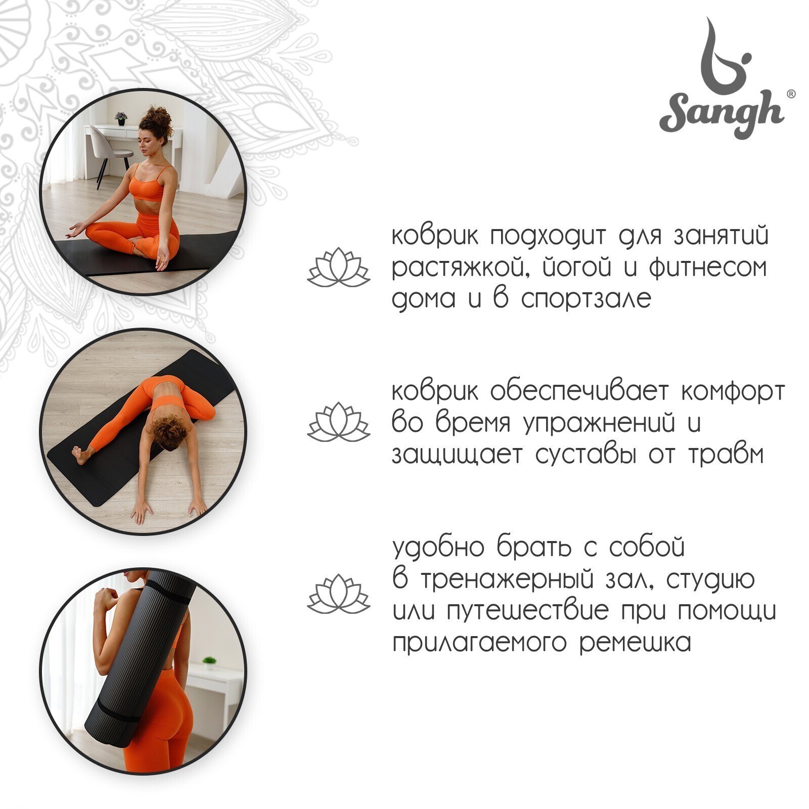 Коврик подходит для занятий йогой и фитнесом дома и в спортивных залах. Помогает в выполнении асан или других упражнений. Смягчает упор тела на твёрдую поверхность. Сохраняет форму после выполнения упражнений.