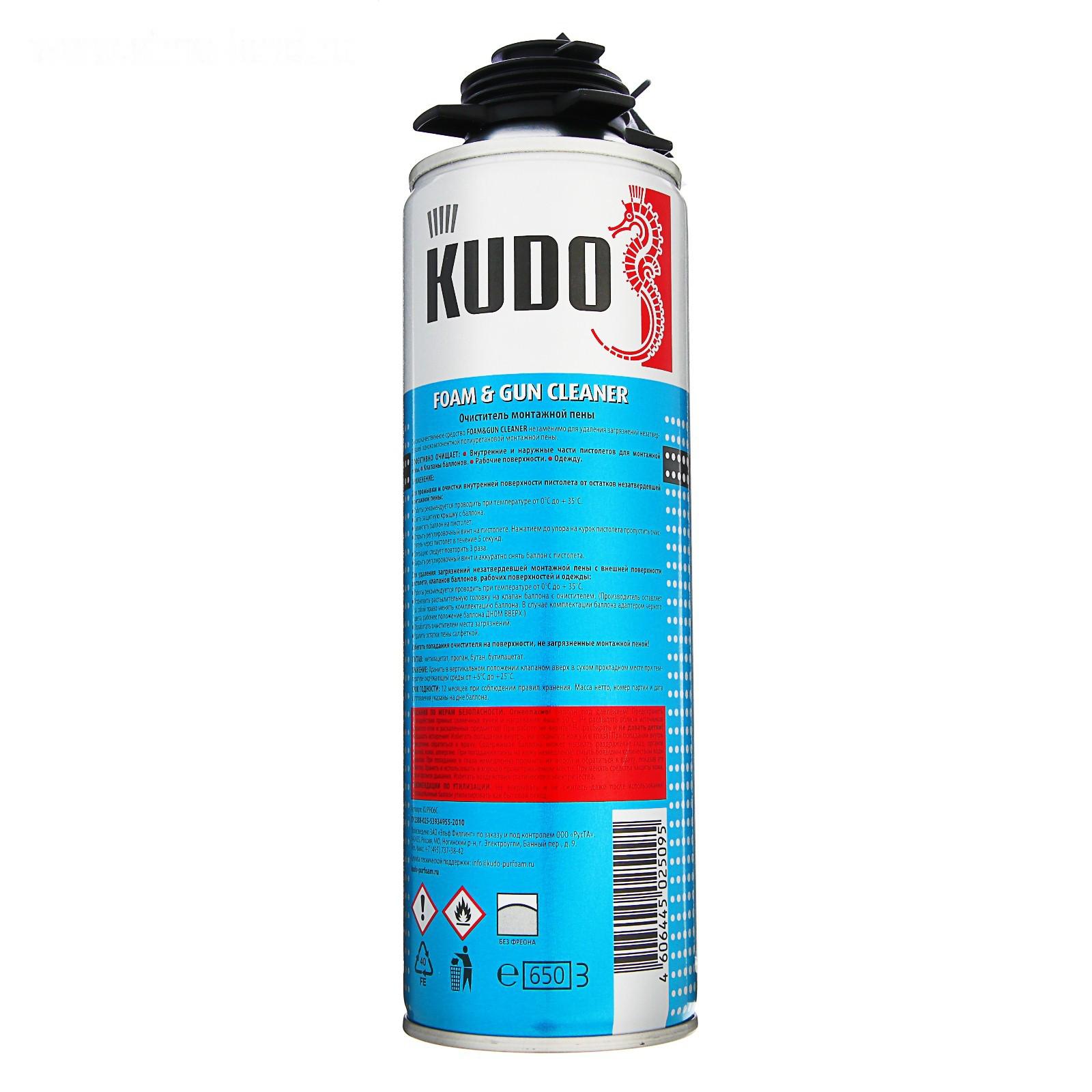Очиститель Kudo Foam & Gun Cleaner удаляет загрязнения незатвердевшей однокомпонентной полиуретановой монтажной пены c разных поверхностей.