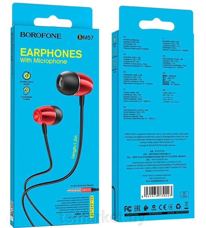 Hoco наушники внутриканальные с микрофоном BM57 красный 1.2 м BOROFONE