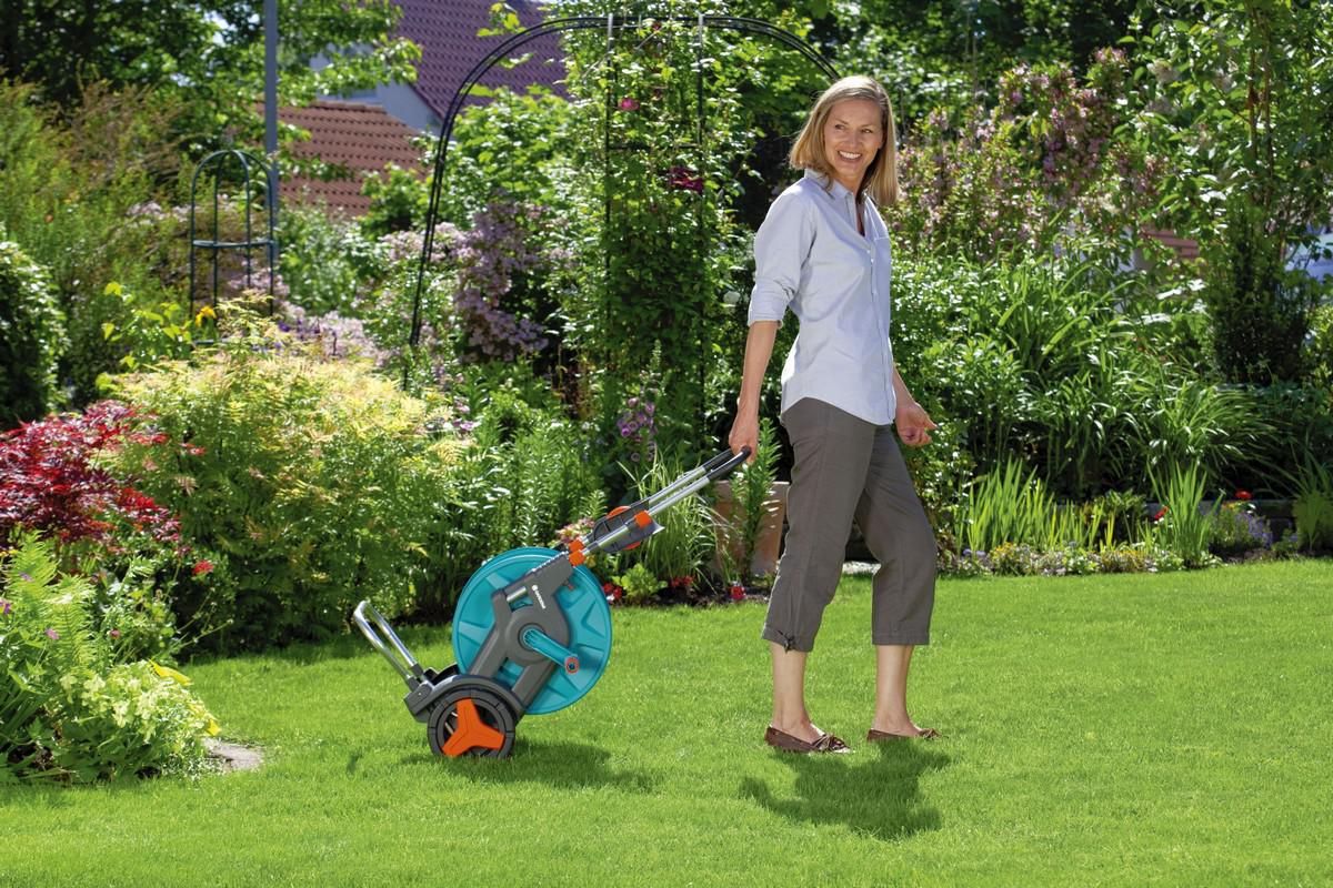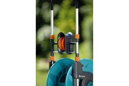 Вращающаяся ось предотвращает перекручивание шланга при его намотке и размотке. Характерной особенностью всех тележек для шланга GARDENA являются небольшие, но очень эффективные детали.