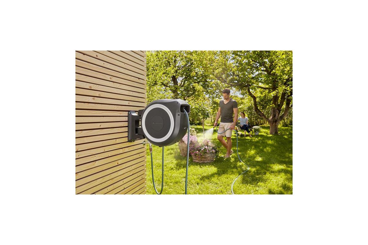 - Поставляется с настенным кронштейном, 35-метровым ирригационным шлангом, соединительным шлангом, всеми необходимыми оригинальными деталями системы GARDENA и насадкой с двумя различными вариантами распылительной форсунки;