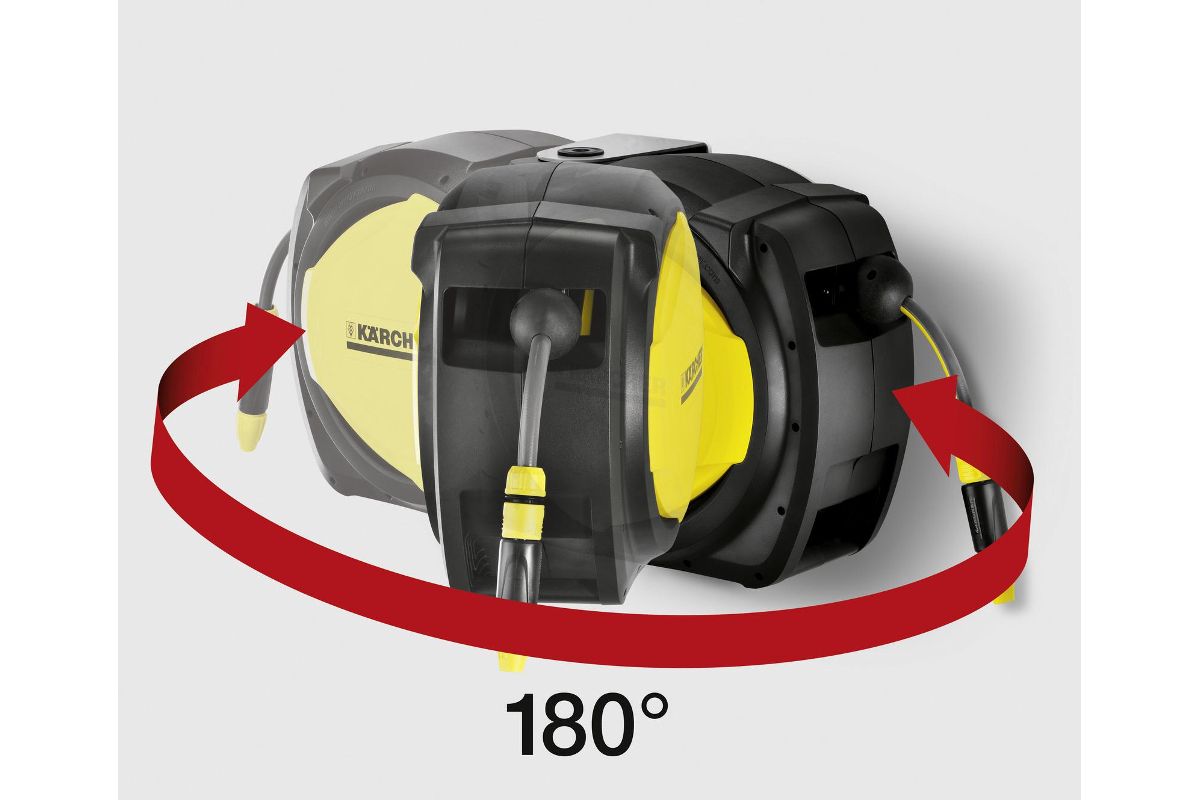 Автоматическая катушка для шланга CR 7.220. Автоматическое упорядоченное сматывание шланга. Легкое вытяжение шланга. Плоский компактный кронштейн для крепления на стене. Отклонение на угол 0° – 180°. Регулируемый ограничитель угла отклонения для защиты стен и окружающих предметов от повреждений. С высококачественным шлангом 1/2'' без содержания фталатов (20 + 2 м), распылителем «Plus» (2.645-177.0), 1 коннектором, 1 коннектором с функцией «Aqua Stop» и штуцером для присоединения к крану G3/4 с переходником G1/2. Удобство хранения принадлежностей. В смонтированном состоянии.