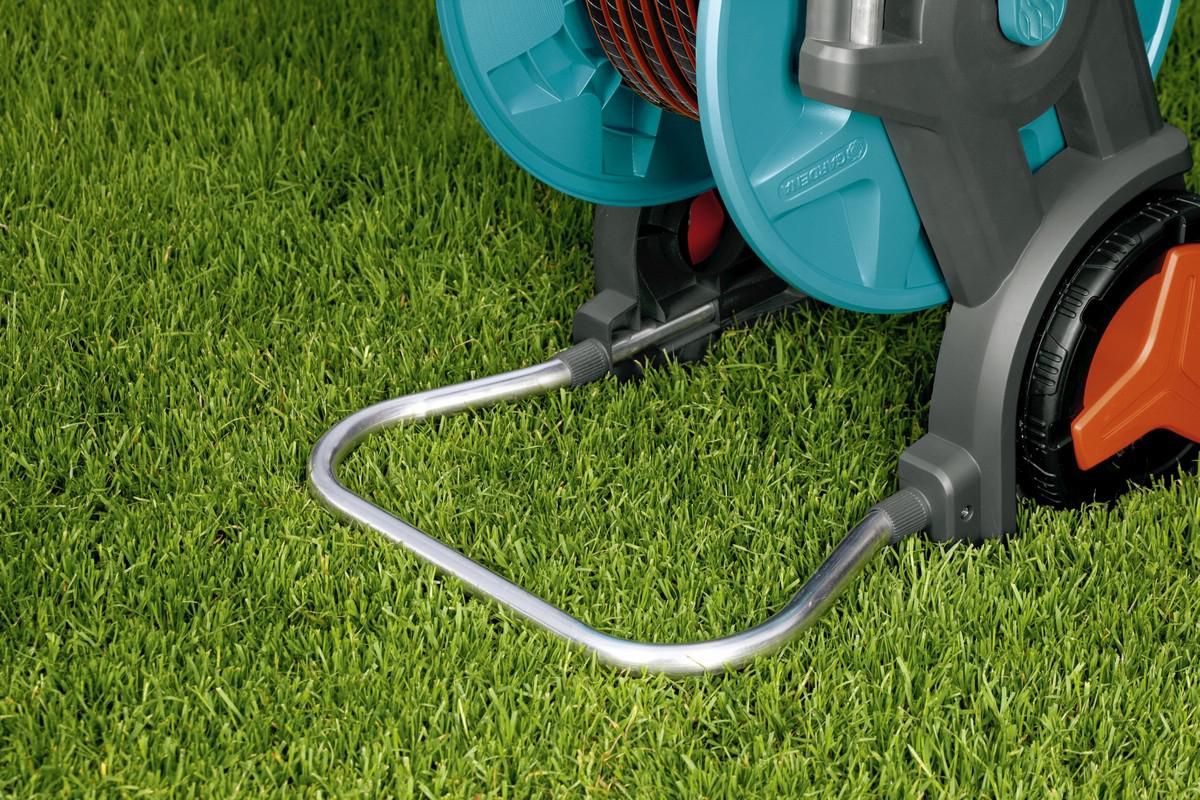 Опоры специальной формы обеспечивают превосходную устойчивость тележки, что облегчает полив, поскольку тележка прочно стоит на опорах даже при натяжении шланга.