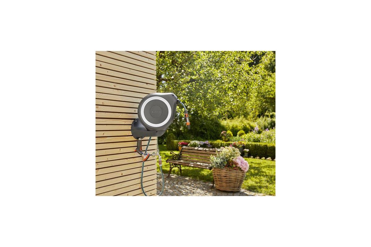 - Поставляется с настенным кронштейном, 20-метровым ирригационным шлангом, соединительным шлангом, всеми необходимыми оригинальными деталями системы GARDENA и насадкой с двумя различными вариантами распылительной форсунки;