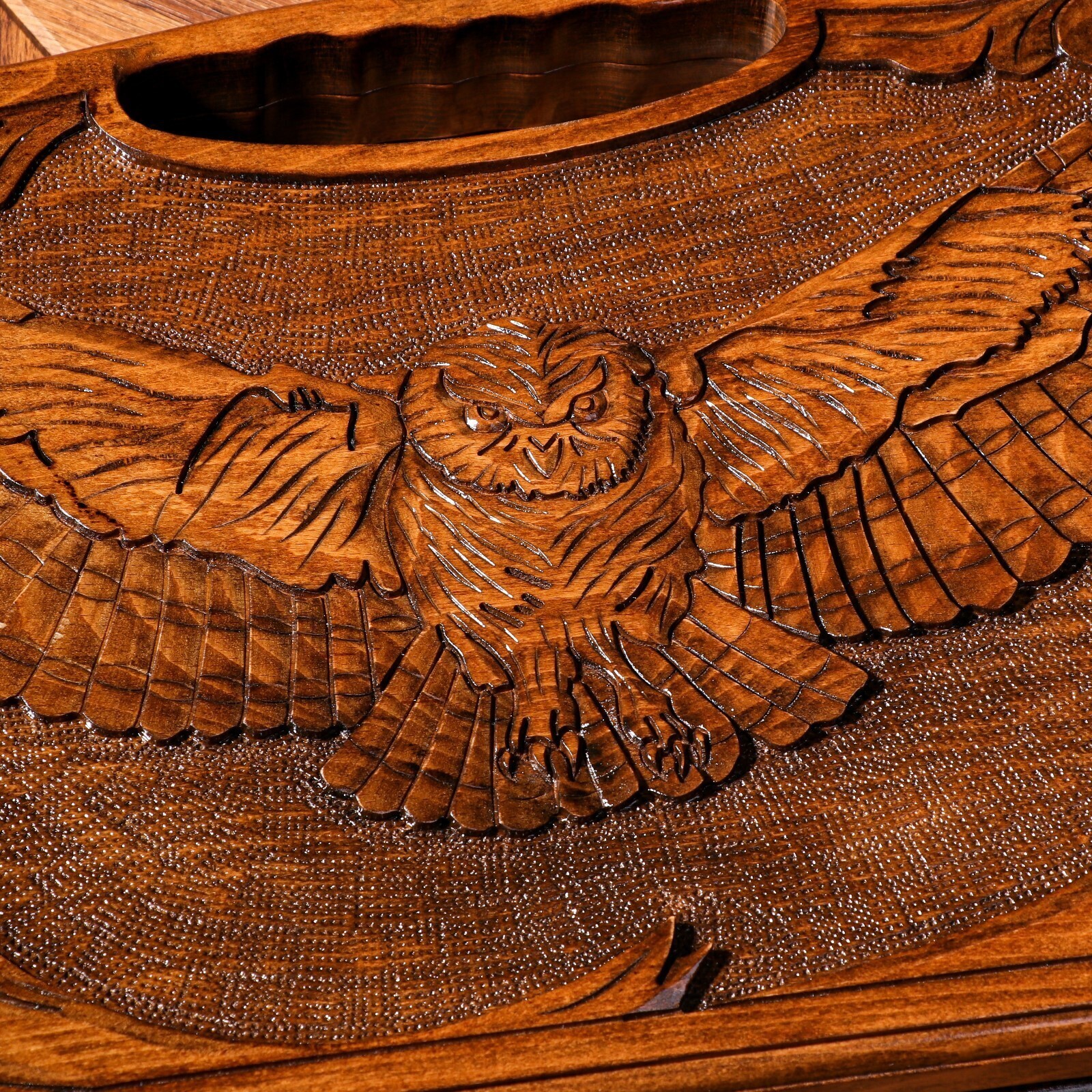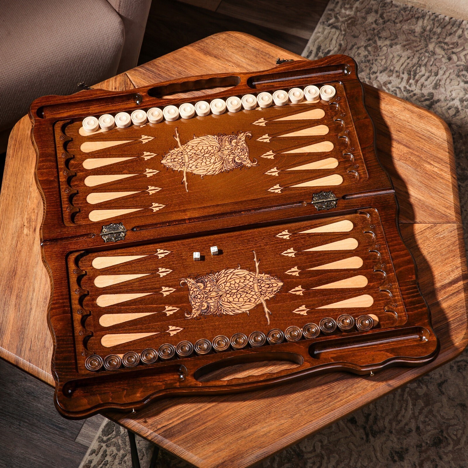 Нарды ручной работы "Филин", глубокая резка, с ручкой, 60х30 см, с шахматным полем, массив ореха, Армения