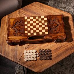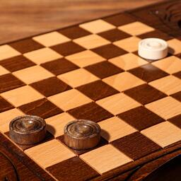 Верхняя внешняя часть доски украшена резным узором. На нижней части доски расположено шахматное поле и обрамлено резным узором. В комплект входят фишки для шашек.
