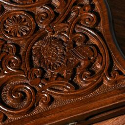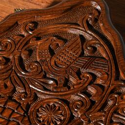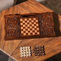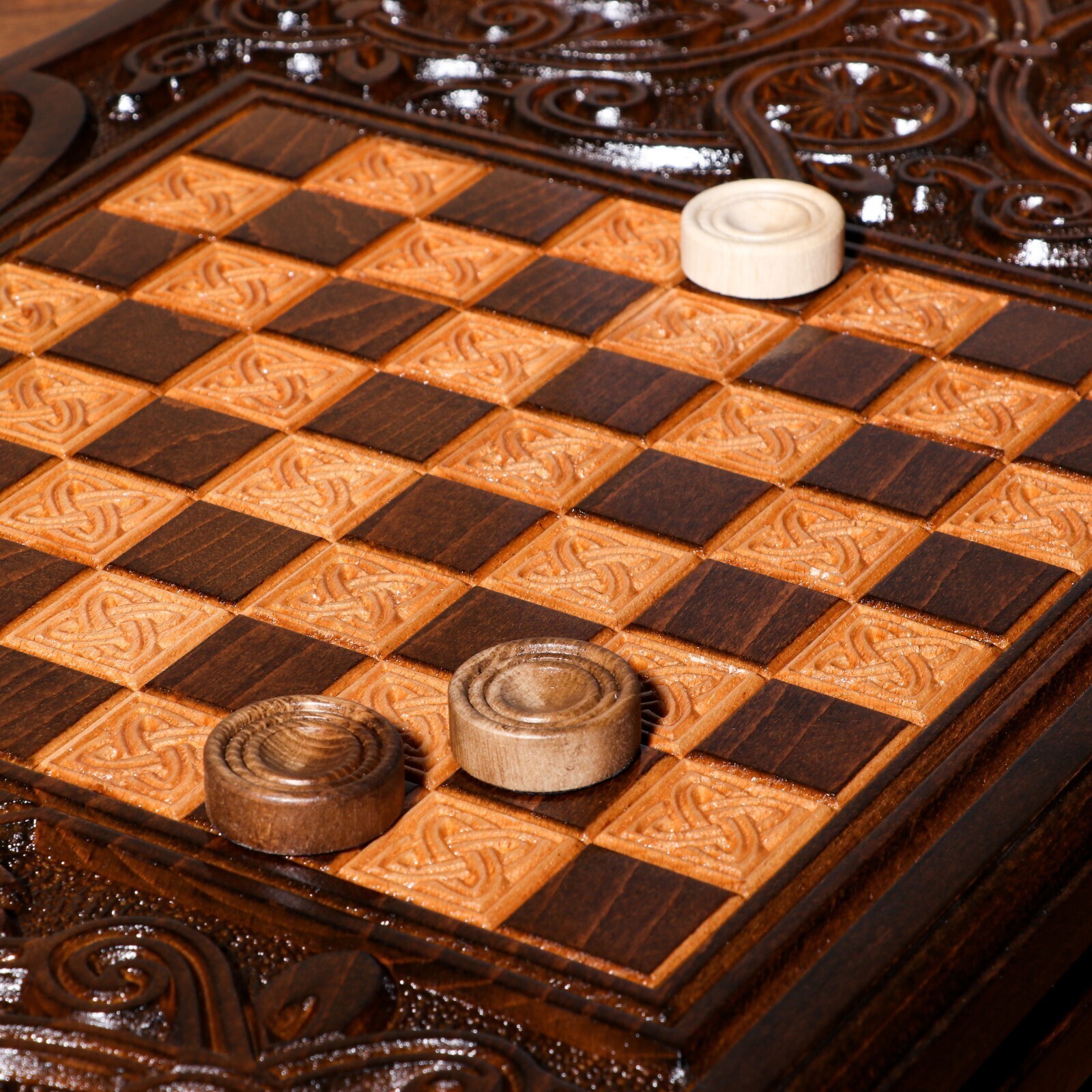 Верхняя внешняя часть доски украшена резным узором. На нижней части доски расположено шахматное поле и обрамлено резным узором. В комплект входят фишки для шашек.