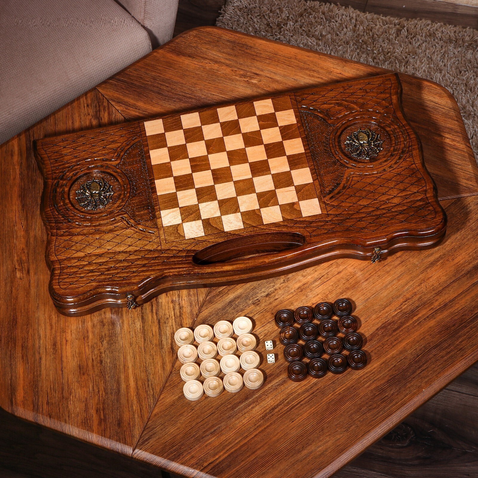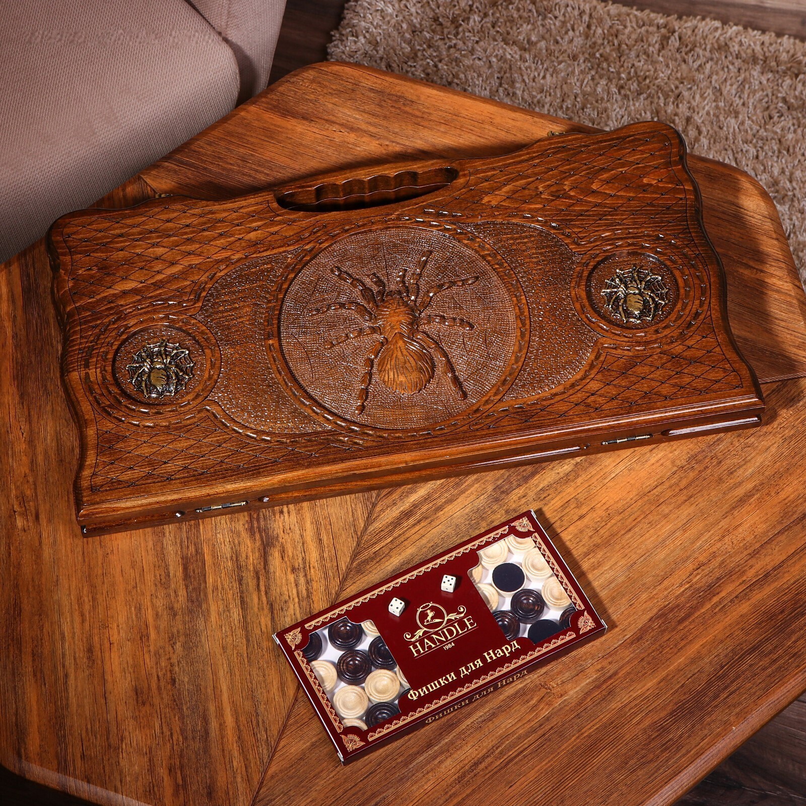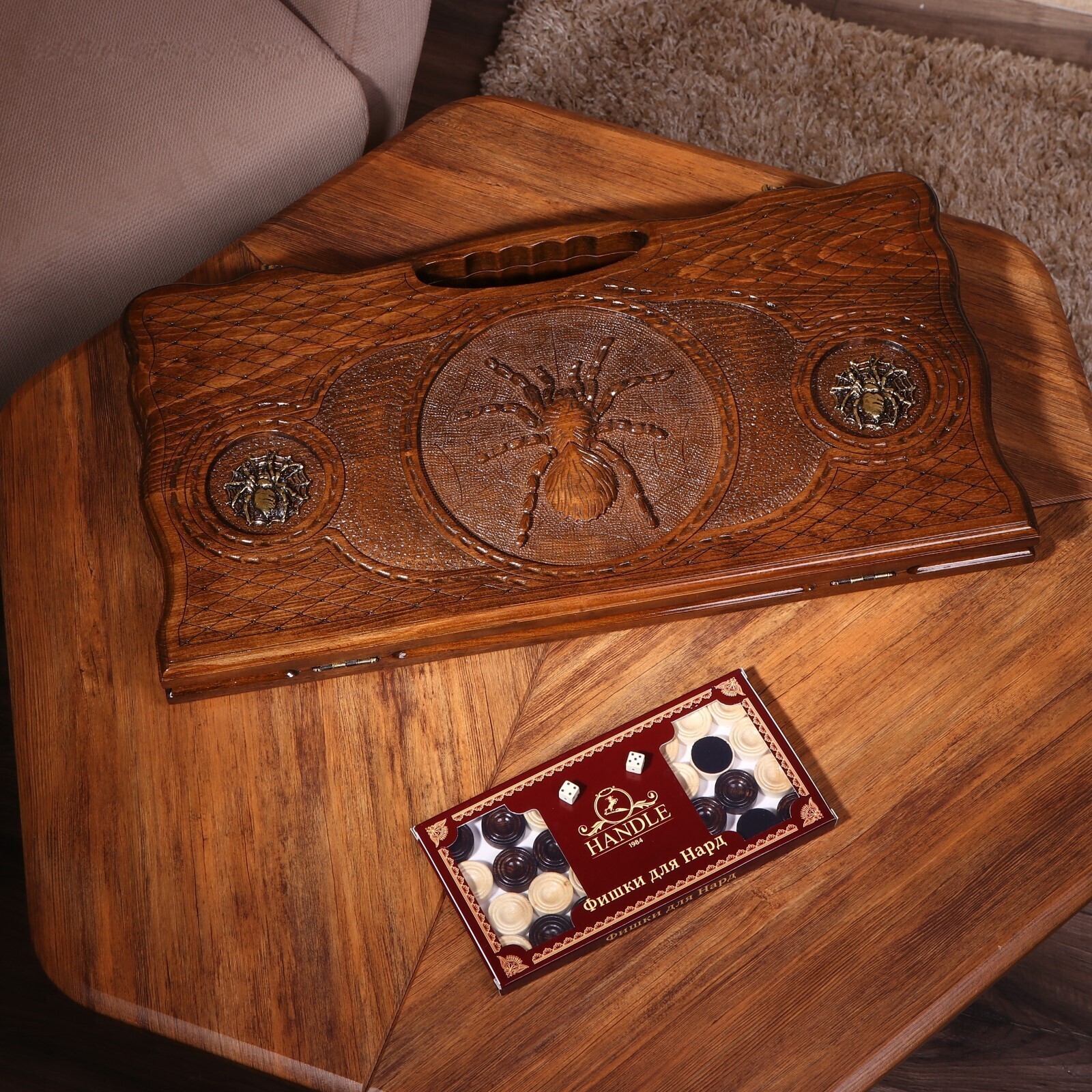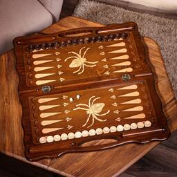 Нарды ручной работы "Паук", глубокая резка, с ручкой, 60х30 см, с шахматным полем, массив ореха, Армения