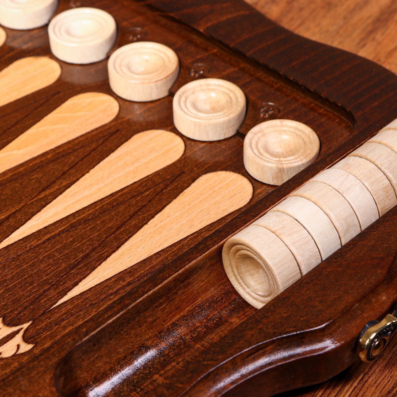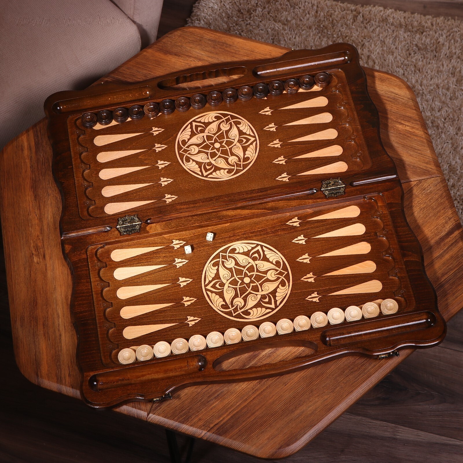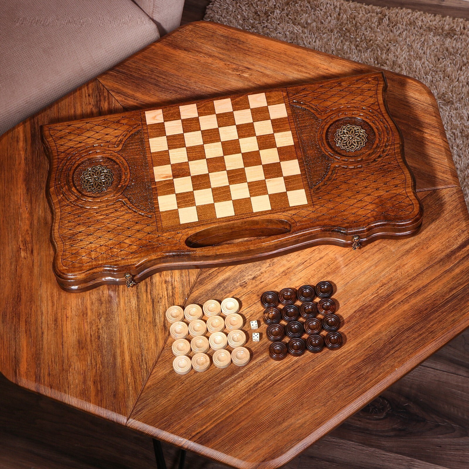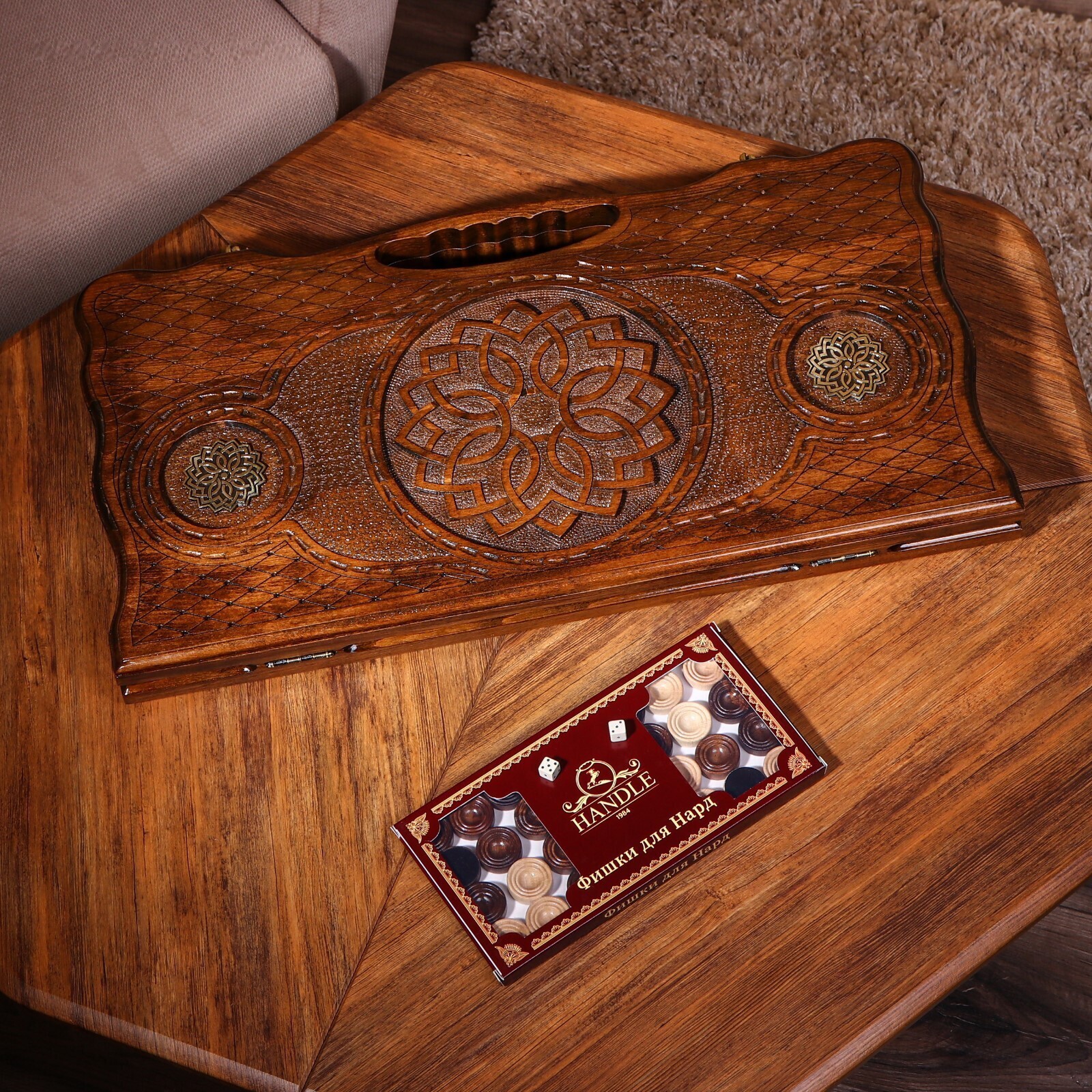 Нарды ручной работы "Узор 2", глубокая резка, с ручкой, 60х30 см, с шахматным полем, массив ореха, Армения