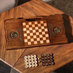 Верхняя внешняя часть доски украшена резным узором. На нижней части доски расположено шахматное поле и обрамлено резным узором. В комплект входят фишки для шашек.