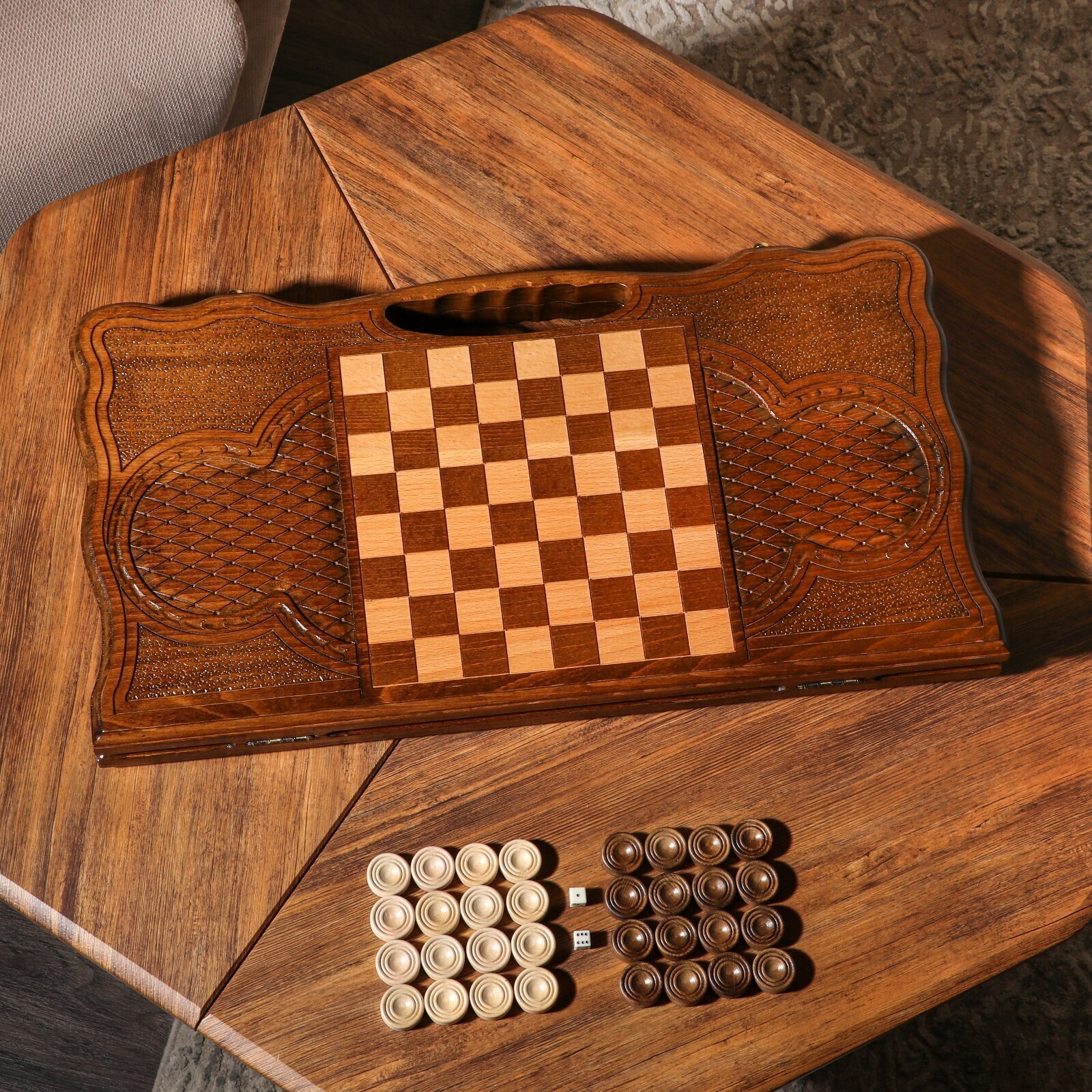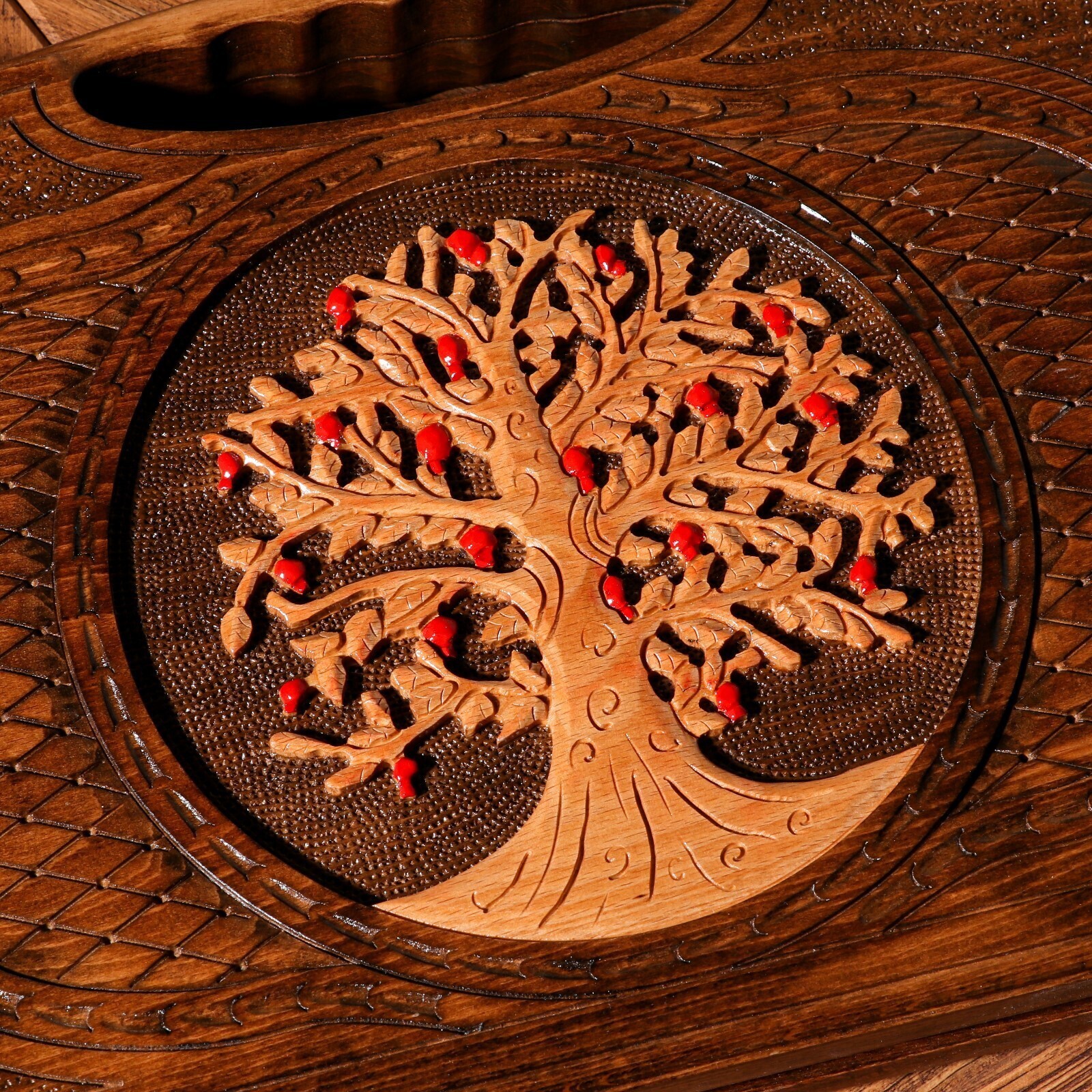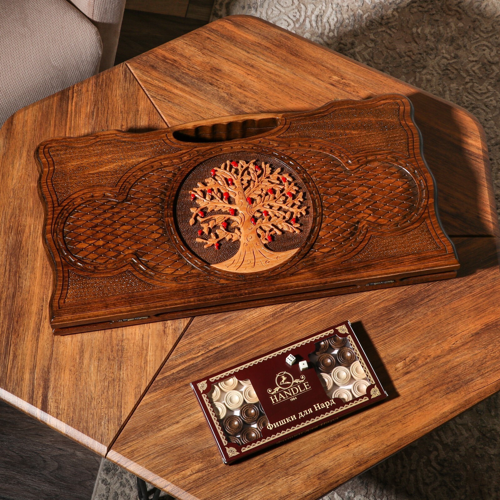 Нарды ручной работы "Древо жизни", глубокая резка, с ручкой, 60х30 см, с шахматным полем, Армения