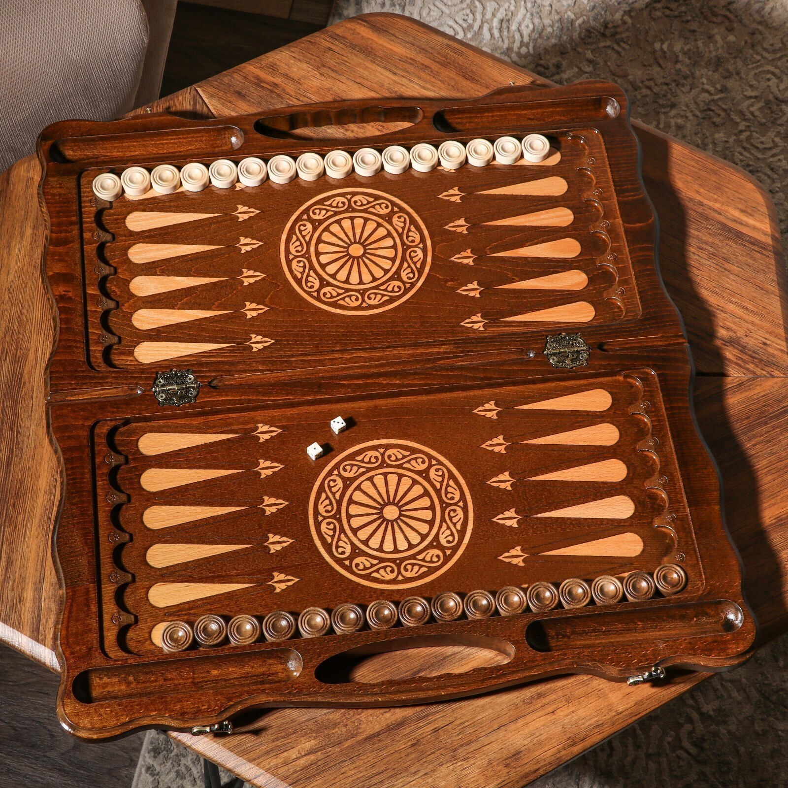 С внутренней стороны доска полностью оформлена под поле для игры в нарды. Фишки вырезаны в ручную, и имеют тканное основание для легкого скольжения по полю.