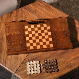 Верхняя внешняя часть доски украшена резным узором. На нижней части доски расположено шахматное поле и обрамлено резным узором. В комплект входят фишки для шашек.