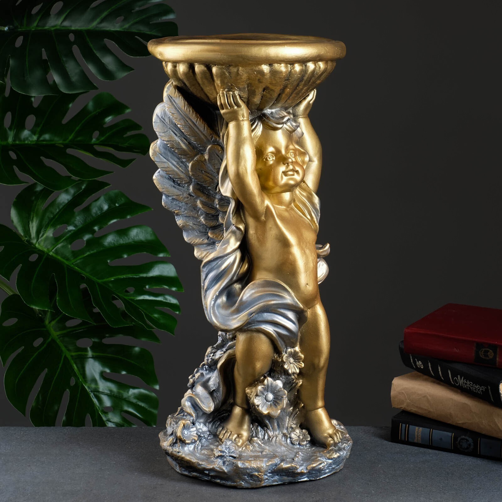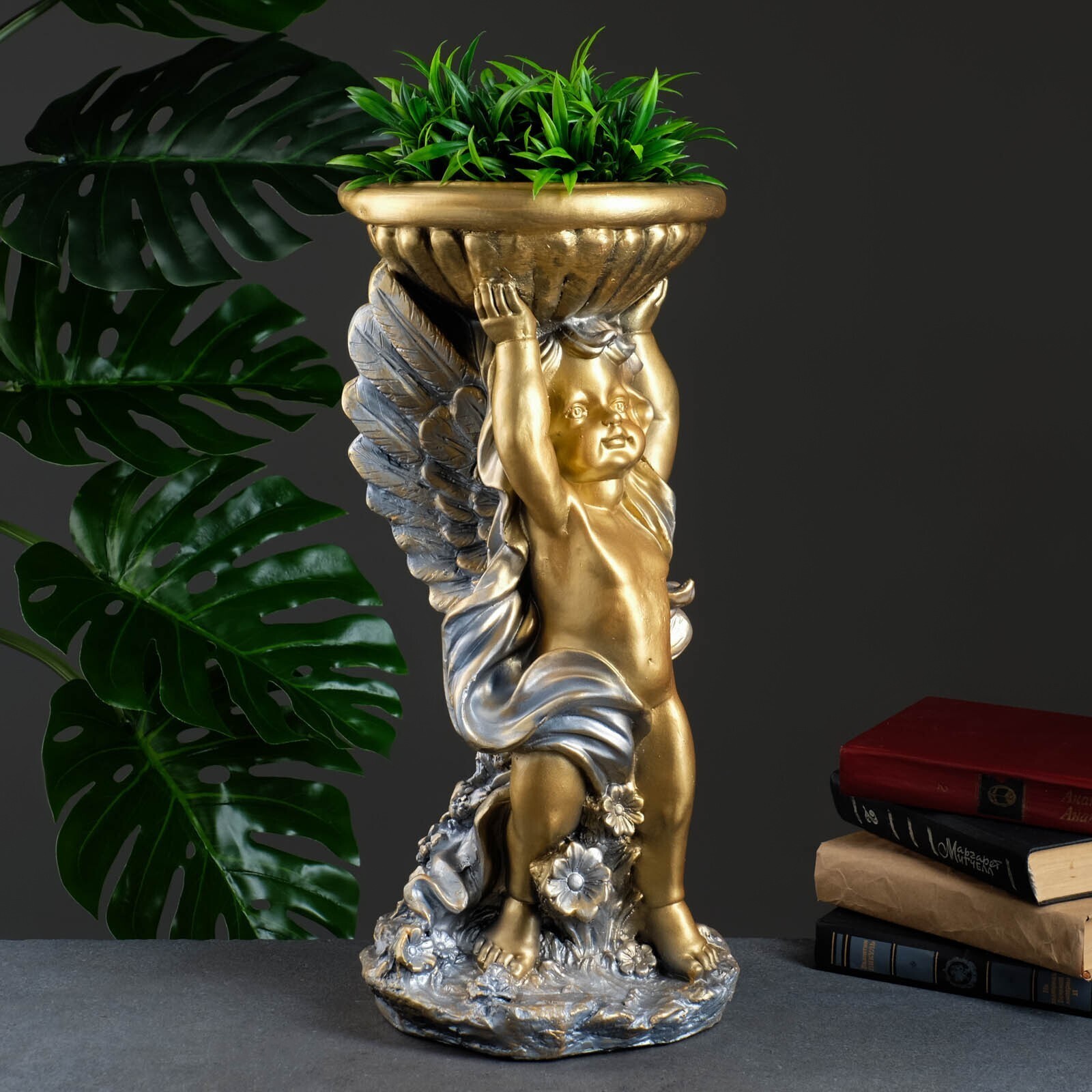 Фигурное кашпо "Ангел с чашей" бронза / серебро 0,6 л / 24х50х24см