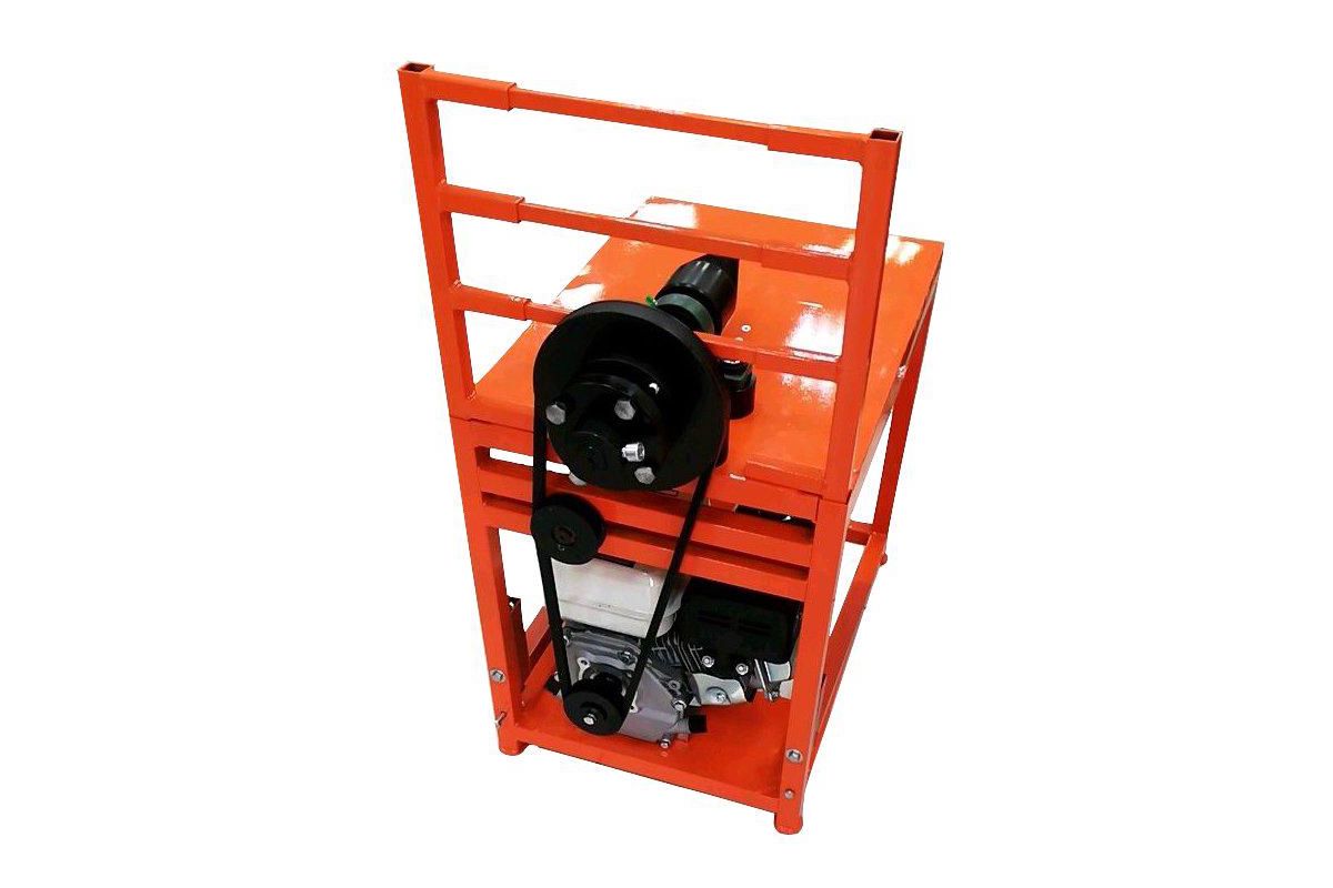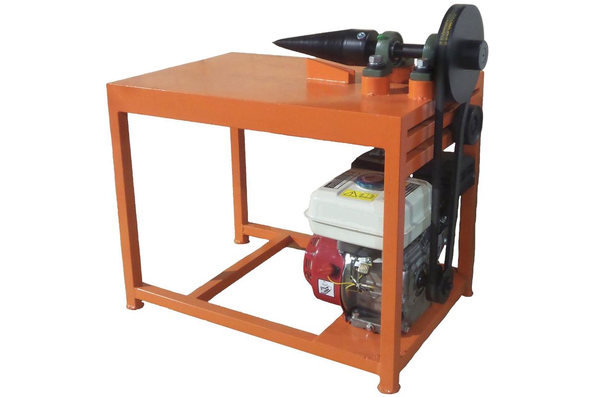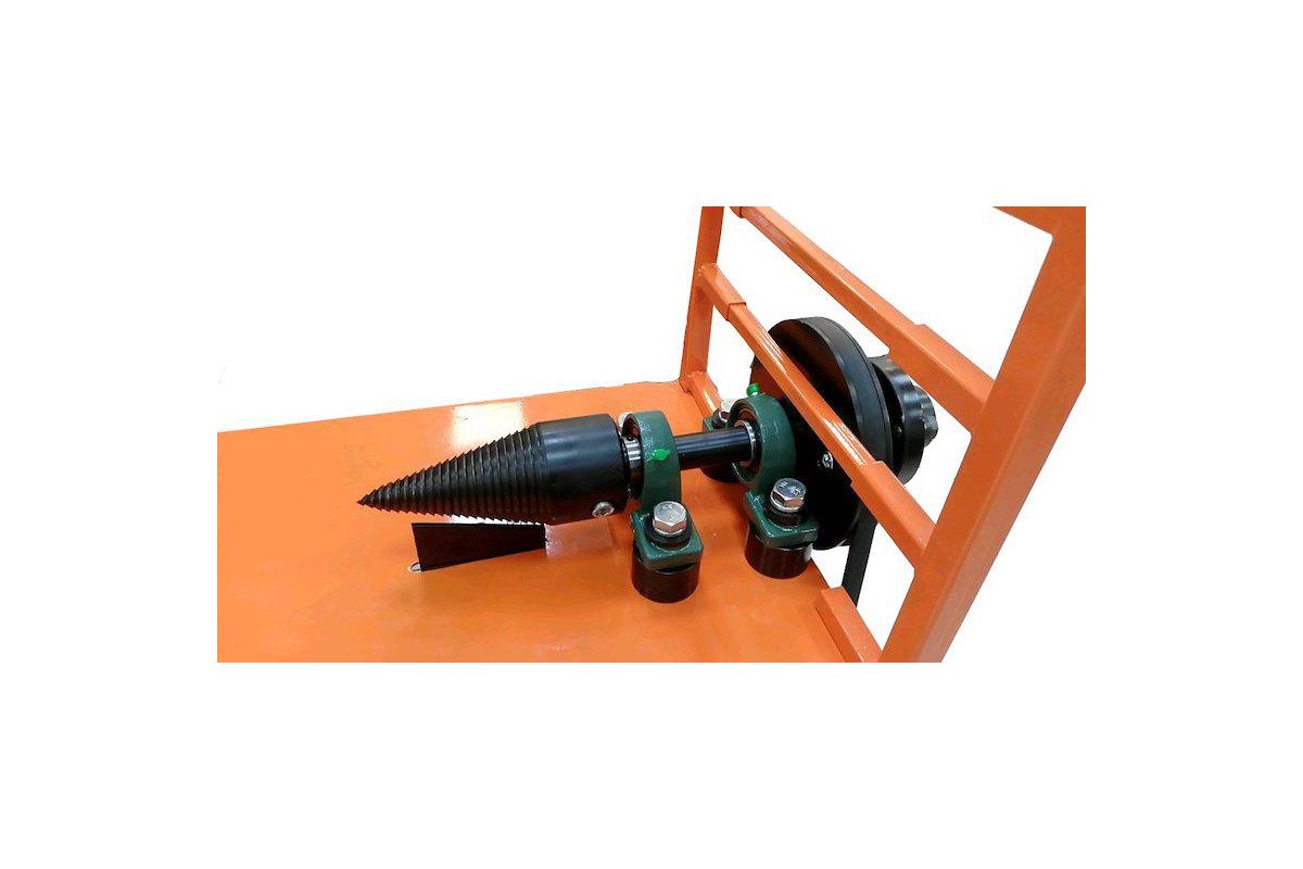 Станок дровокол с коническим буром (шуруп), который при вворачивании (ввинчивании) в чурку разрывает её на части. Вращение от силового агрегата (двигателя) передаётся на шпиндель с коническим буром с помощью ремённой передачи.