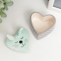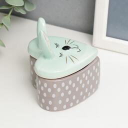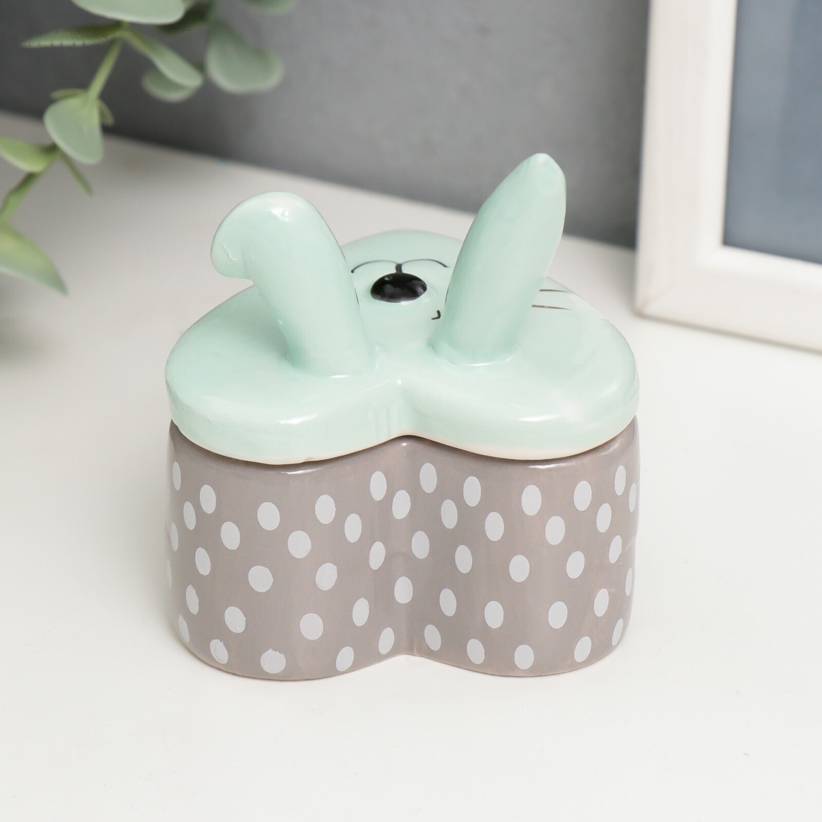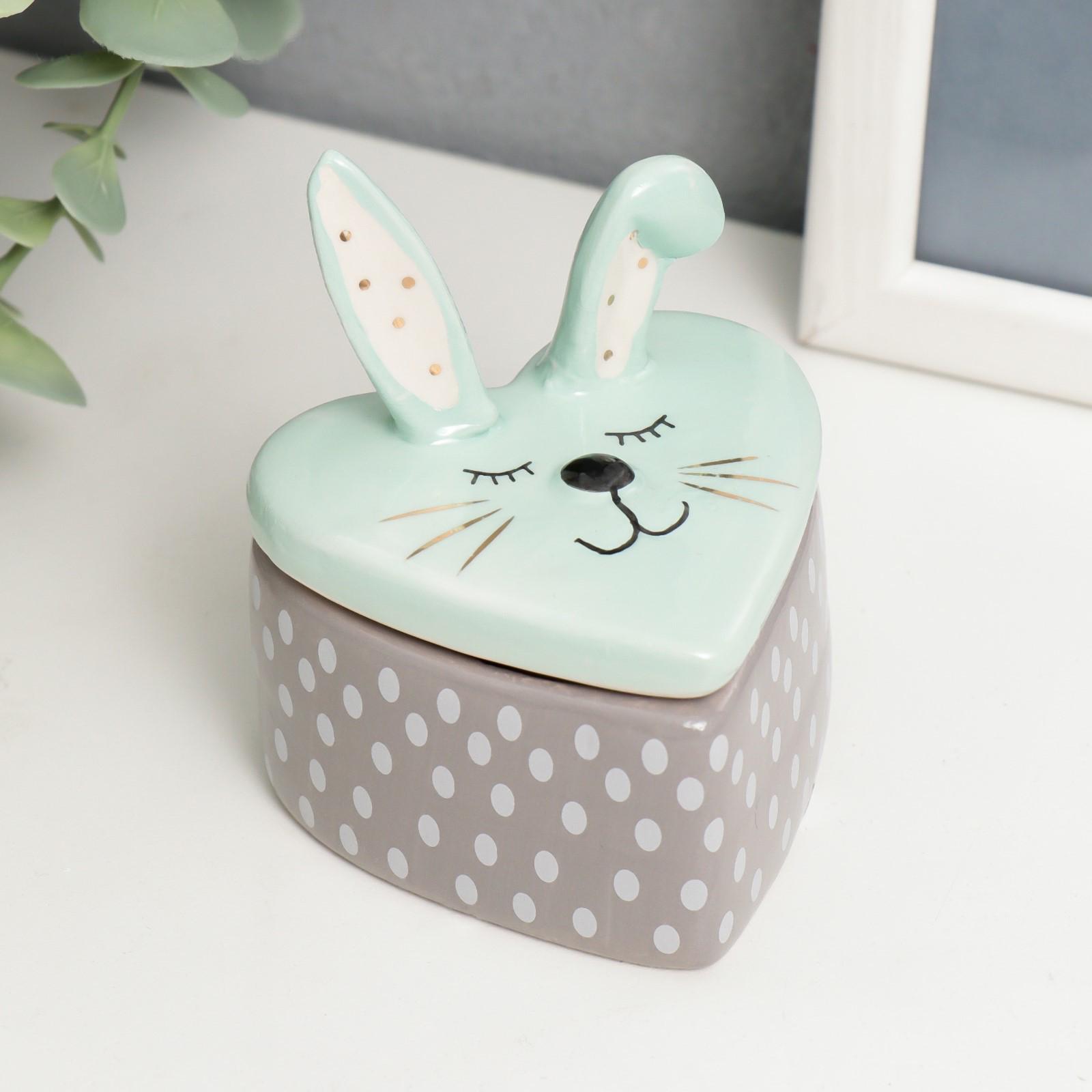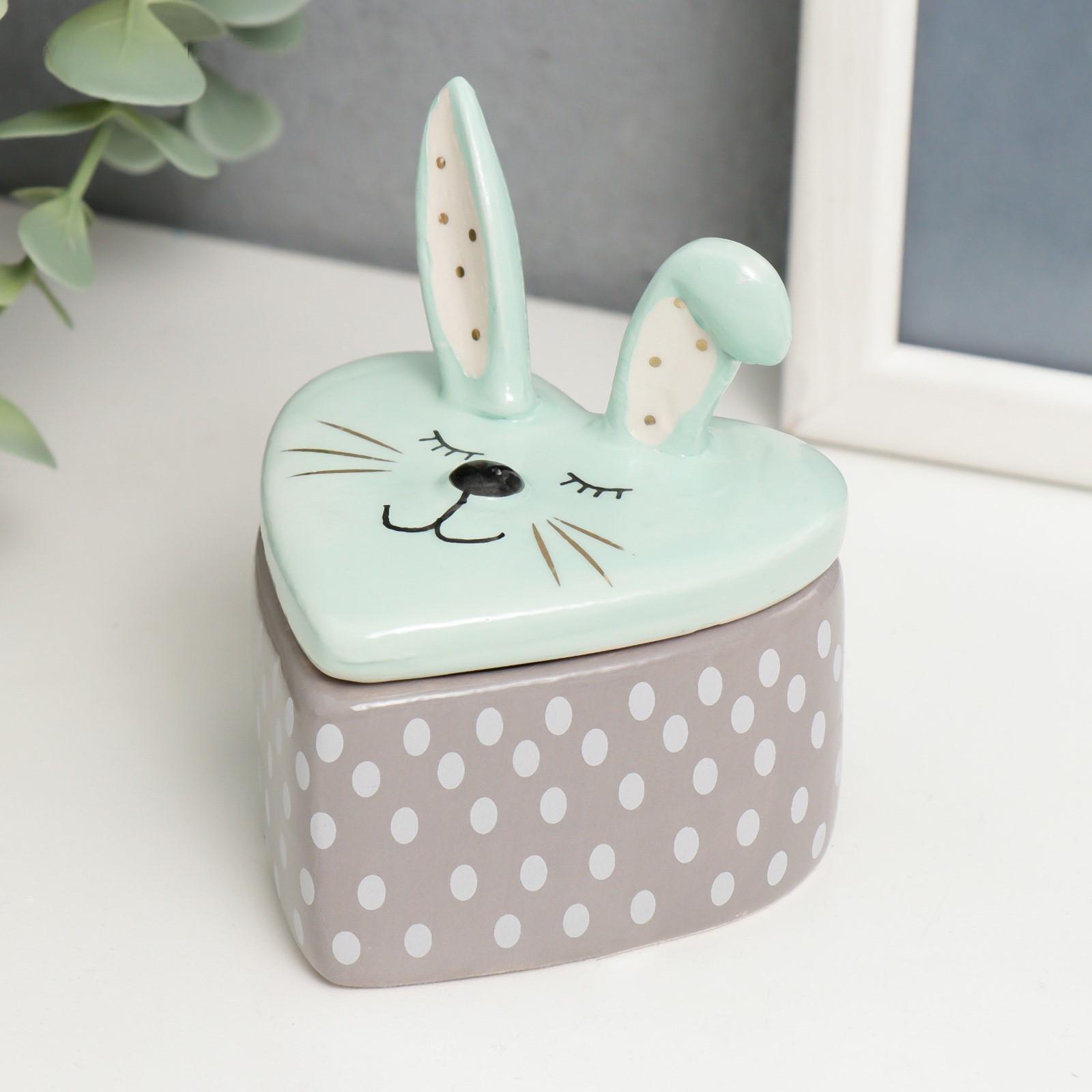 Шкатулка керамика "Зайка-сердечко в крапинку" серо-мятный 7х6,7х8,6 см
