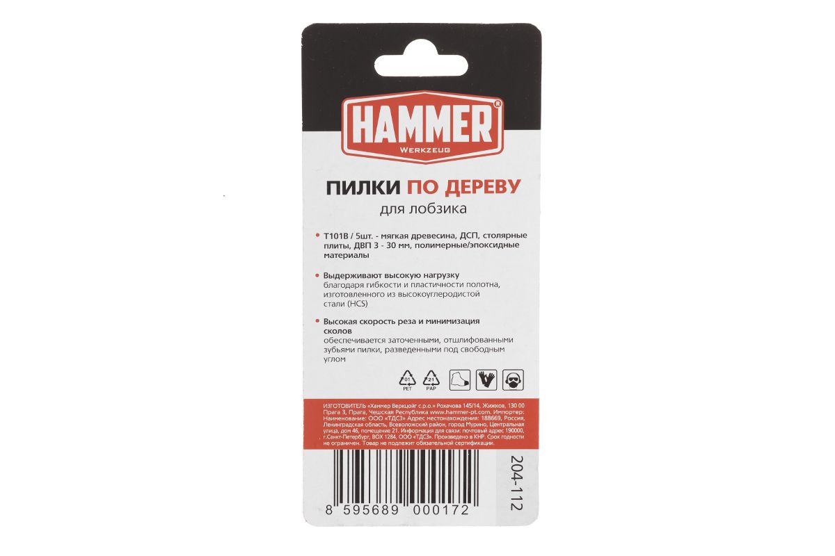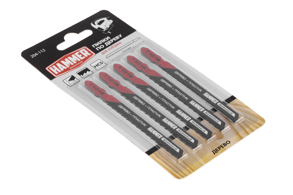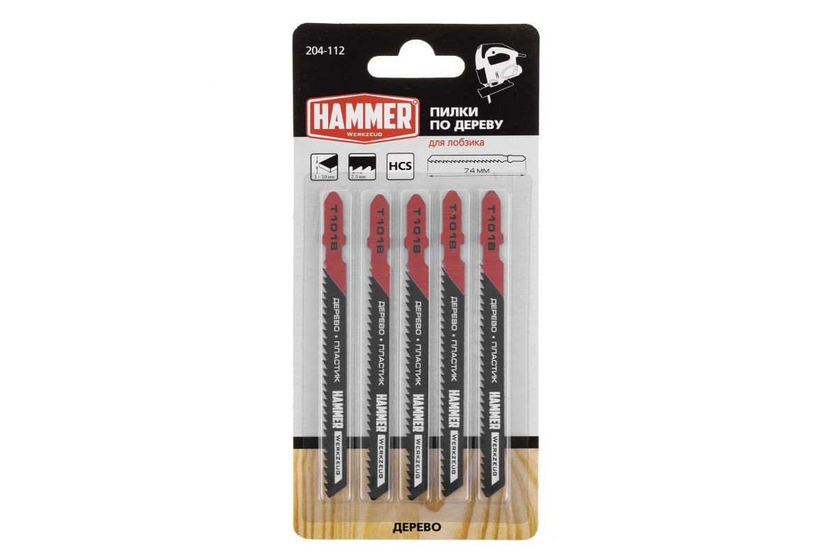 Пилка для лобзика Hammer Flex 204-112 JG WD T101B дерево\пластик, 74мм, шаг 2.5, HCS, 5шт.