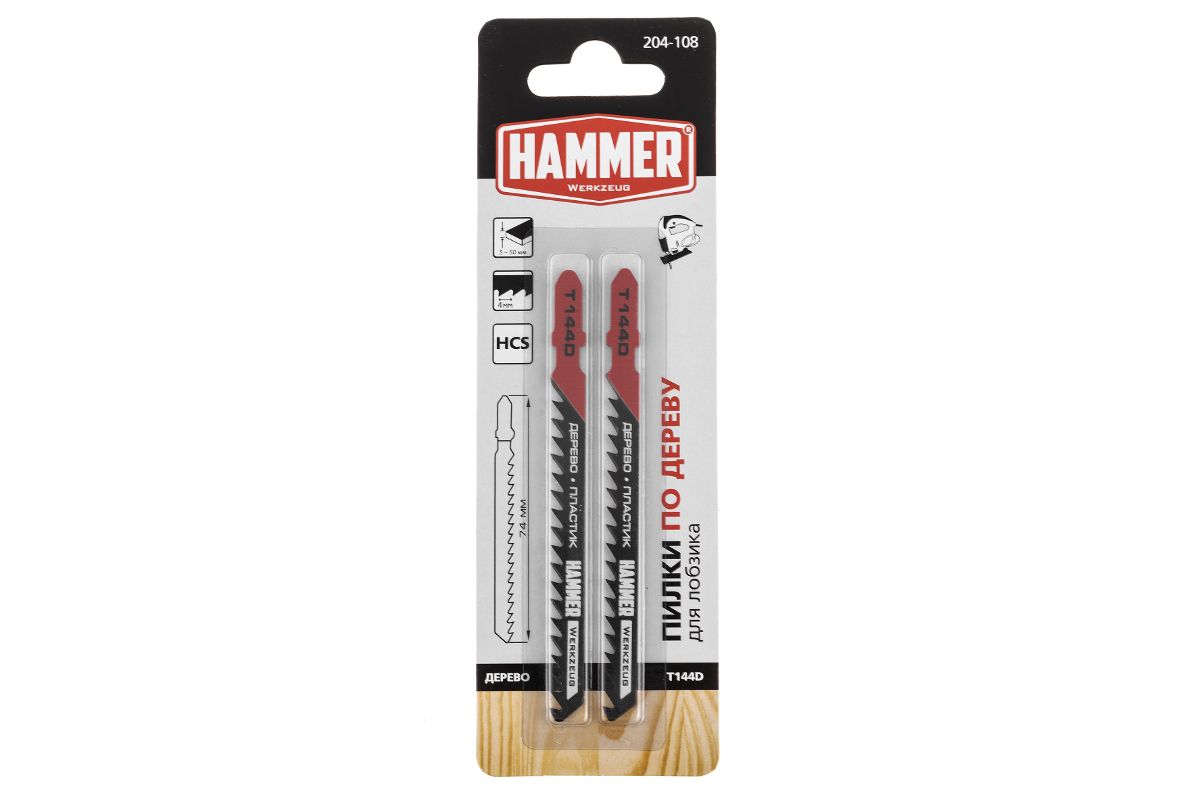 Пилка для лобзика Hammer Flex 204-108 JG WD-PL T144D дерево, 74мм, шаг 4.0, HCS, 2шт.