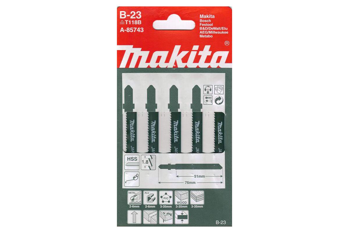 Пилка для лобзика MAKITA A-85743 B-23 металл, 76мм, шаг 1.8, HSS, 5шт.
