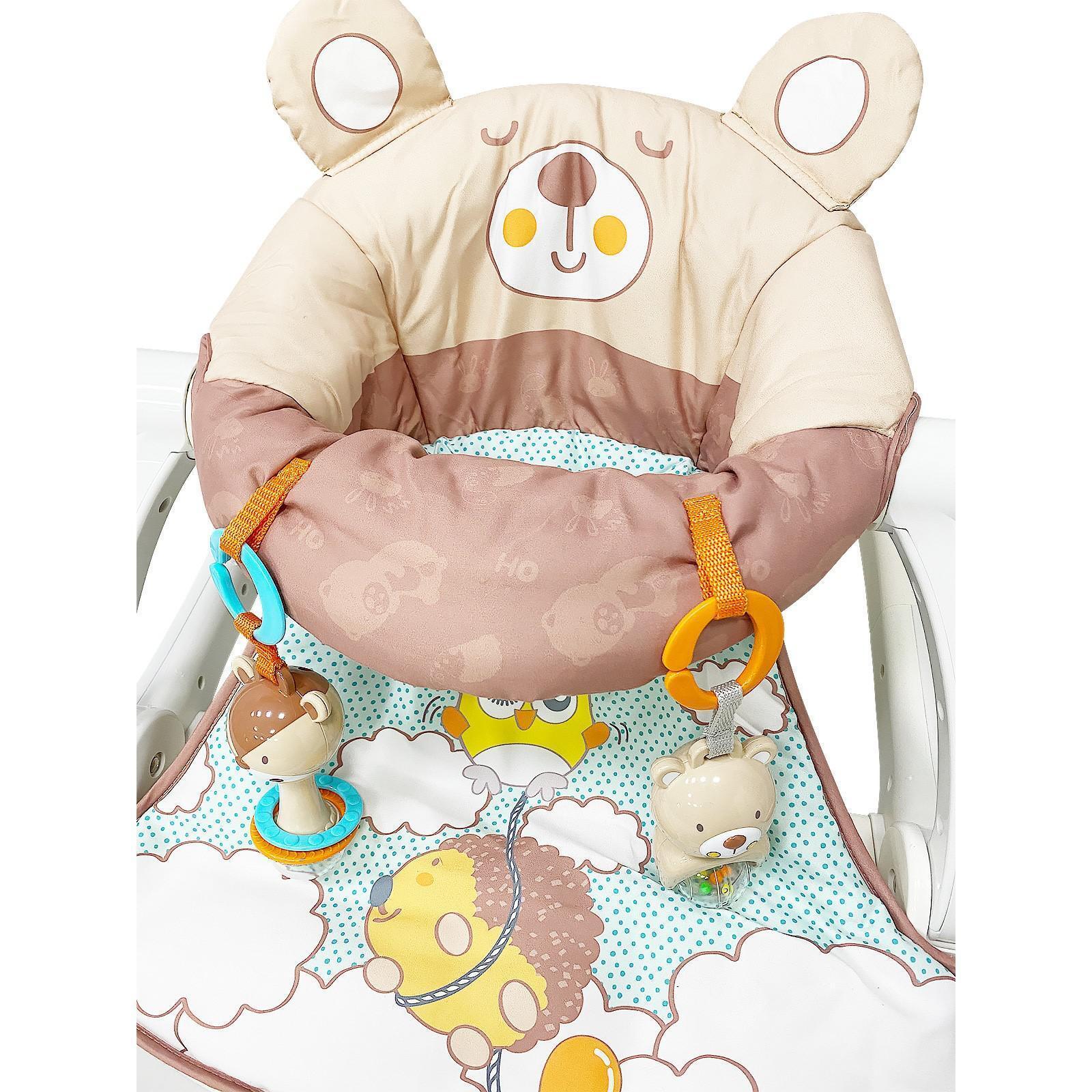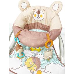 Колыбель оснащена ремнями безопасности, полозьями для качания, а так же игрушками.