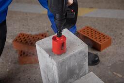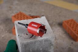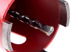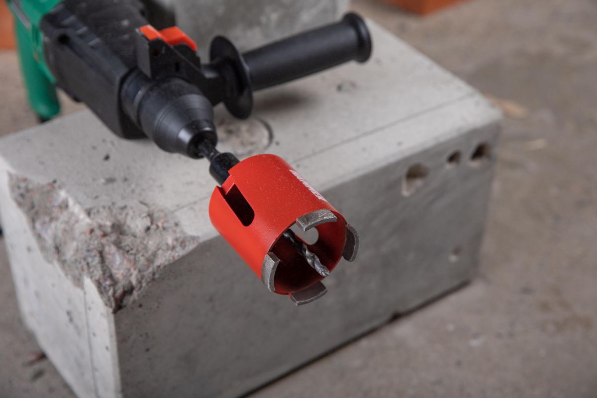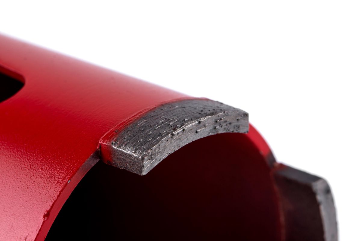 Алмазная коронка для безударного сверления перфораторами SDS-plus отверстий в бетоне, армированном бетоне и кирпиче. По сравнению с твердосплавными коронками обладает высоким ресурсом, возможностью прохождения арматуры и низкой вибрацией. Рекомендуемая частота оборотов 600-900 об/мин. Возможность работы без подачи воды. Охлаждение водой увеличивает ресурс. Точность сверления обеспечивается направляющим сверлом с твердосплавной напайкой.