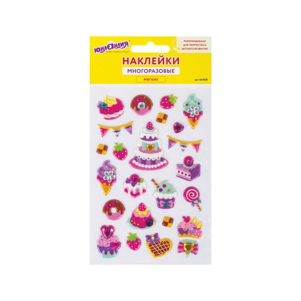 В наборе содержатся перламутровые зефирные наклейки, украшенные акриловыми стразами, с изображением разных сладостей в количестве 23 штук. Наклейки отличаются высочайшим качеством печати и цветопередачи. Мягкие аппетитные сладости украсят тетради, дневники, гаджеты и любые поделки, дополнив их яркими блестящими акцентами. Качественный клеевой слой позволяет приклеивать и отклеивать наклейки несколько раз, не оставляя следов на поверхности. При этом каждый раз наклейка надёжно фиксируется и продолжает долго радовать своей красотой. Товар премиум-качества, относится к среднему ценовому сегменту.