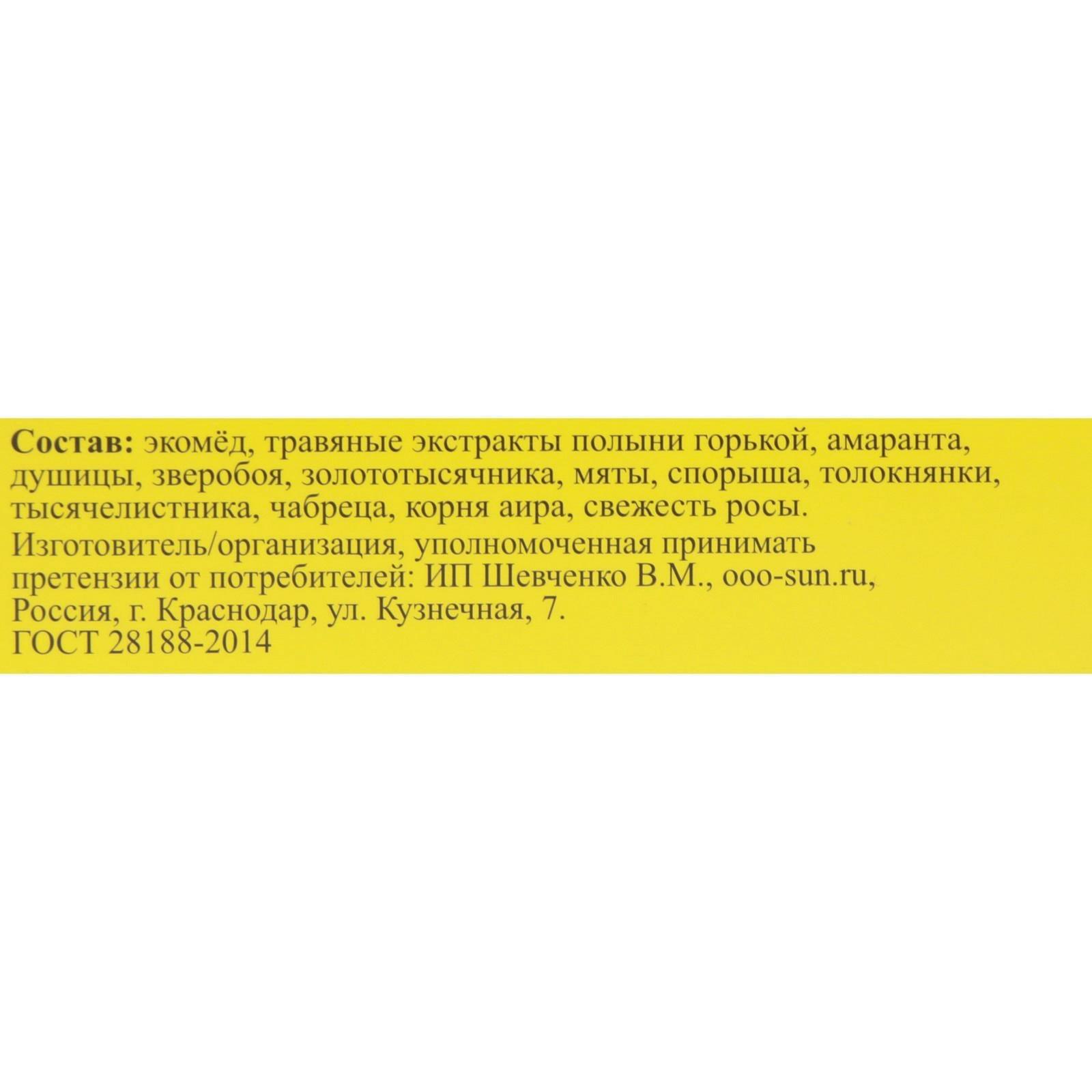 Состав: экомёд, травяные экстракты: полынь горькая, амарант, душица, зверобой, золототысячник, мята, спорыш, толокнянка, тысячелистник, чабрец, корень аира.