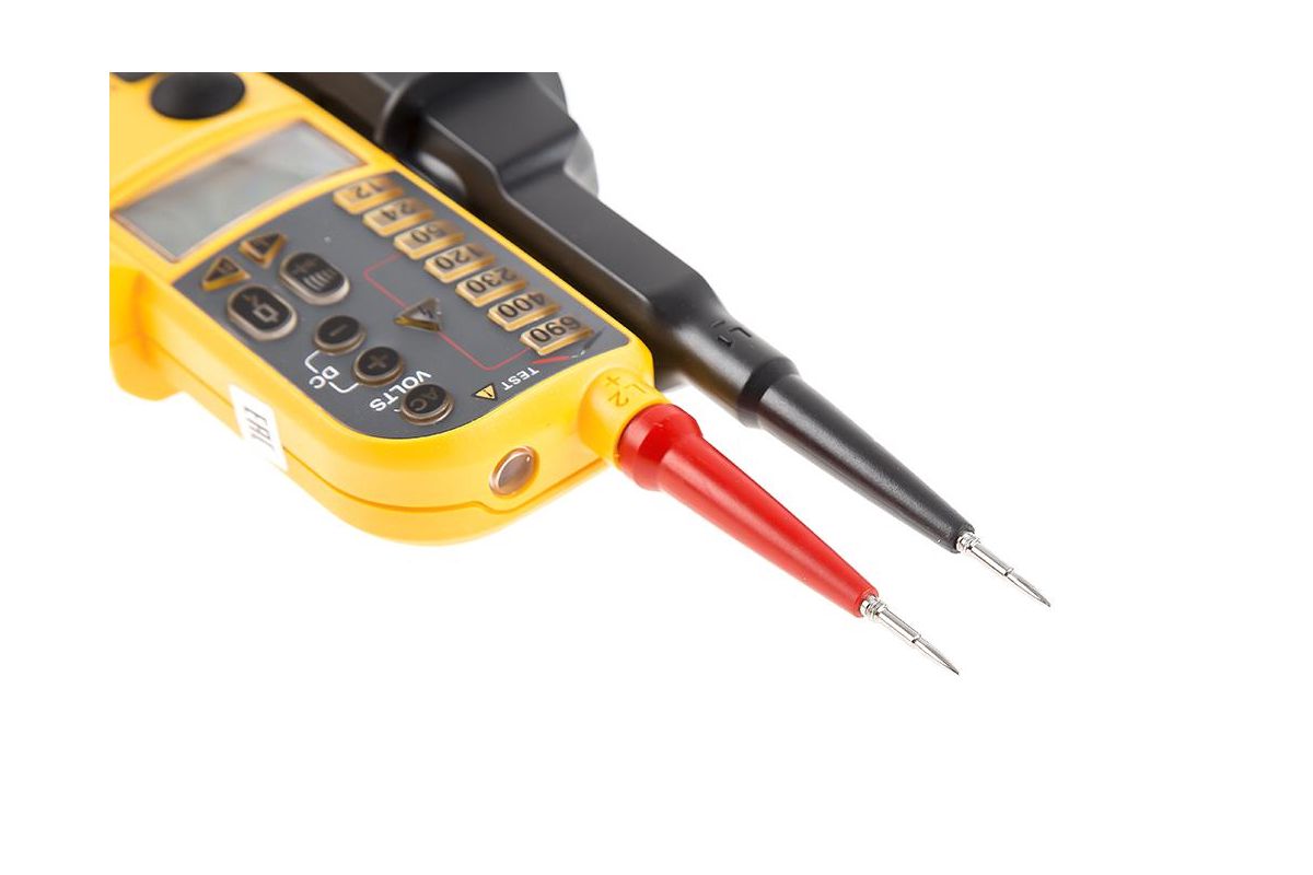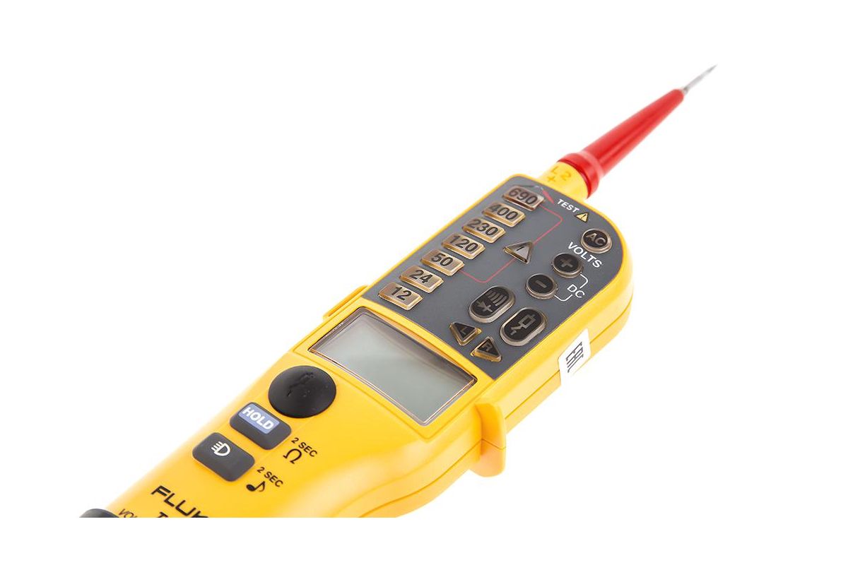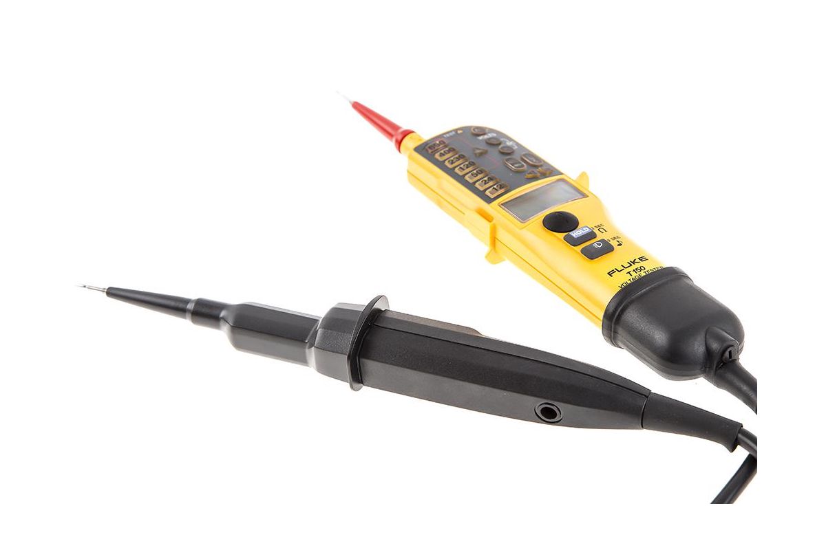 FLUKE T150 — двухполюсный тестер промышленного класса, оснащенный функцией омметра (измерение сопротивления). Прибор позволяет работать как с постоянным, так и с переменным током. Результаты измерений выводятся на LCD-дисплей; также имеются звуковой и вибрационный сигнал, светодиодные индикаторы на корпусе.