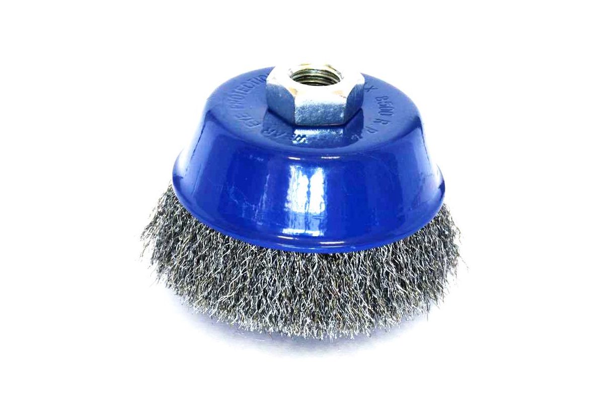 Для угловых шлифмашин. Резьбовая посадка на шпиндель М14. Гофрированная стальная проволока толщиной 0,2мм. Для щадащей обработки дерева, металла, снятия ржавчины, тонких слоев краски.