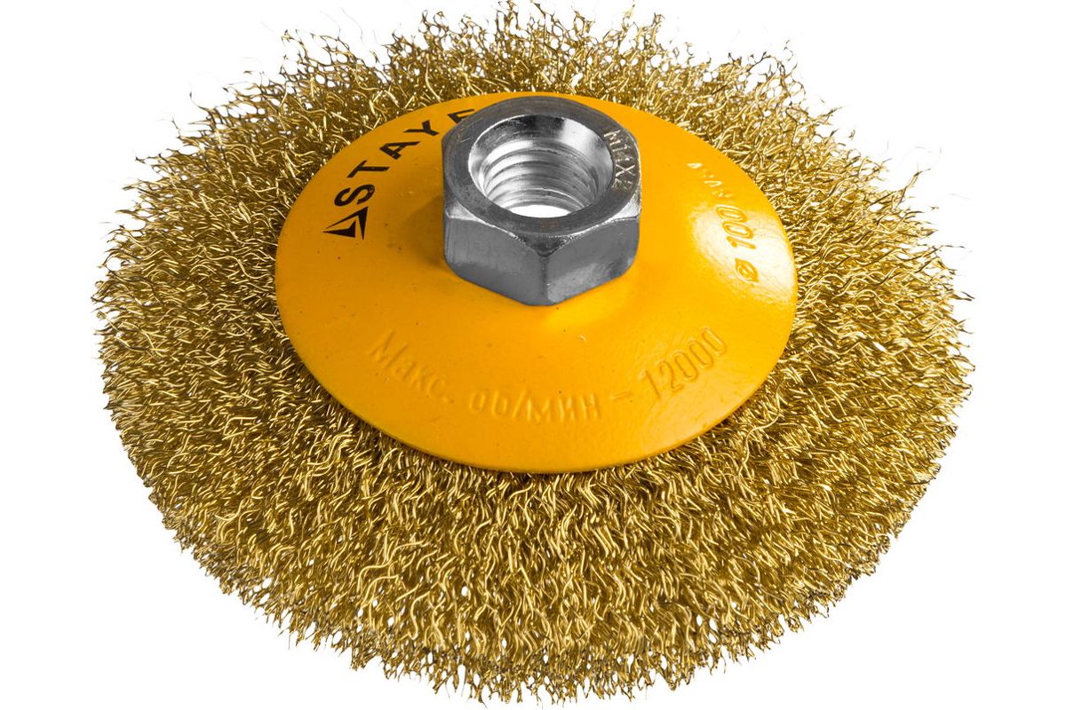 Кордщетка STAYER тарелка 100мм для УШМ гофрированная латунированная сталь (PROFESSIONAL 35133-100)