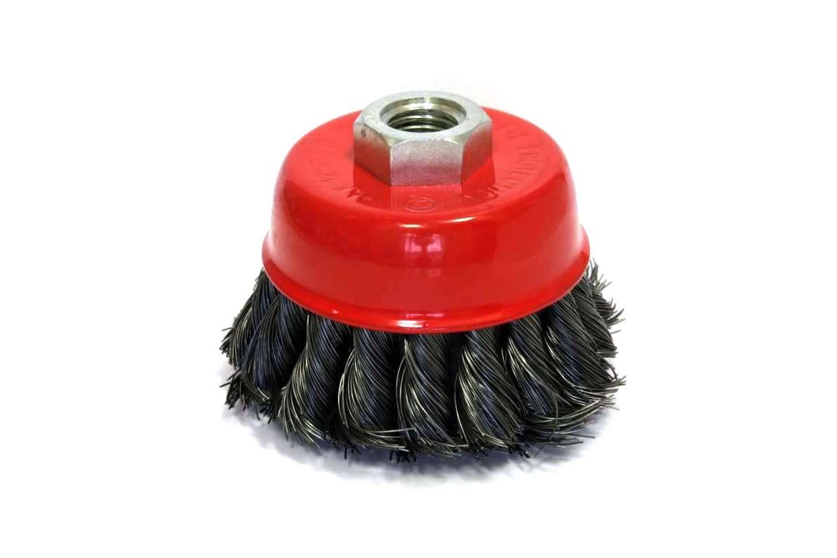 Для угловых шлифмашин. Резьбовая посадка на шпиндель М14. Витая стальная проволока толщиной 0,5мм. Для грубой обработки дерева, шлифовки толстого металла, снятия ржавчины, толстых слоев краски, удаления окалины, обработки сварных швов.